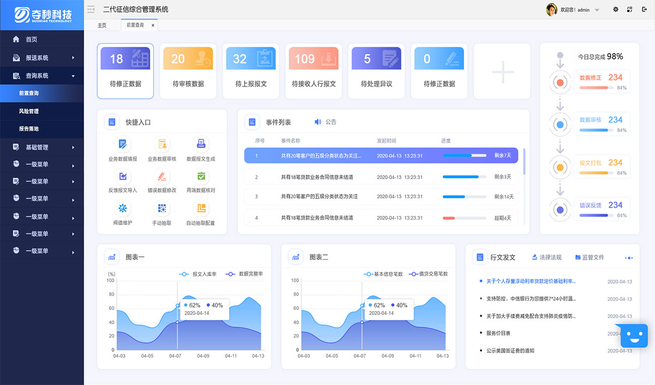 河北奪秒科技有限公司成立于2011年,注冊資金1200萬,是專注于金融信息化及軟硬件程序設計與開發(fā)的高科技軟件企業(yè)。專注于“監(jiān)管報送”,專業(yè)的事由專業(yè)的團隊來做!2020年1月17日至2020年5月3日期間(簡稱切換期),將一代征信系統(tǒng)所有業(yè)務分步切換至二代系統(tǒng)運行。2020年5月,二代征信系統(tǒng)全面接替一代征信系統(tǒng)。