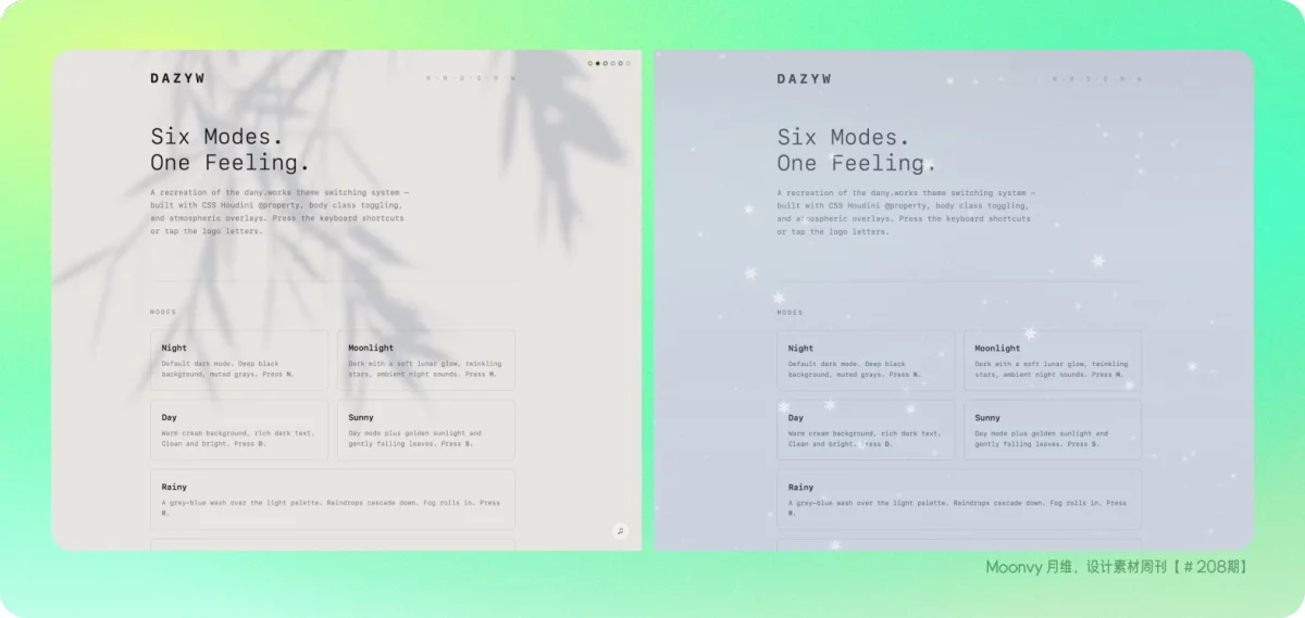 作者為自己的博客增加了多種閱讀狀態,讓視覺外觀不止是淺色、深色,增加了樹影、月色、下雨、下雪等多種自然狀態,網站右上角可以切換體驗