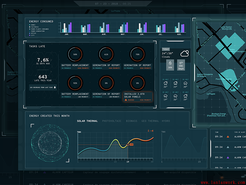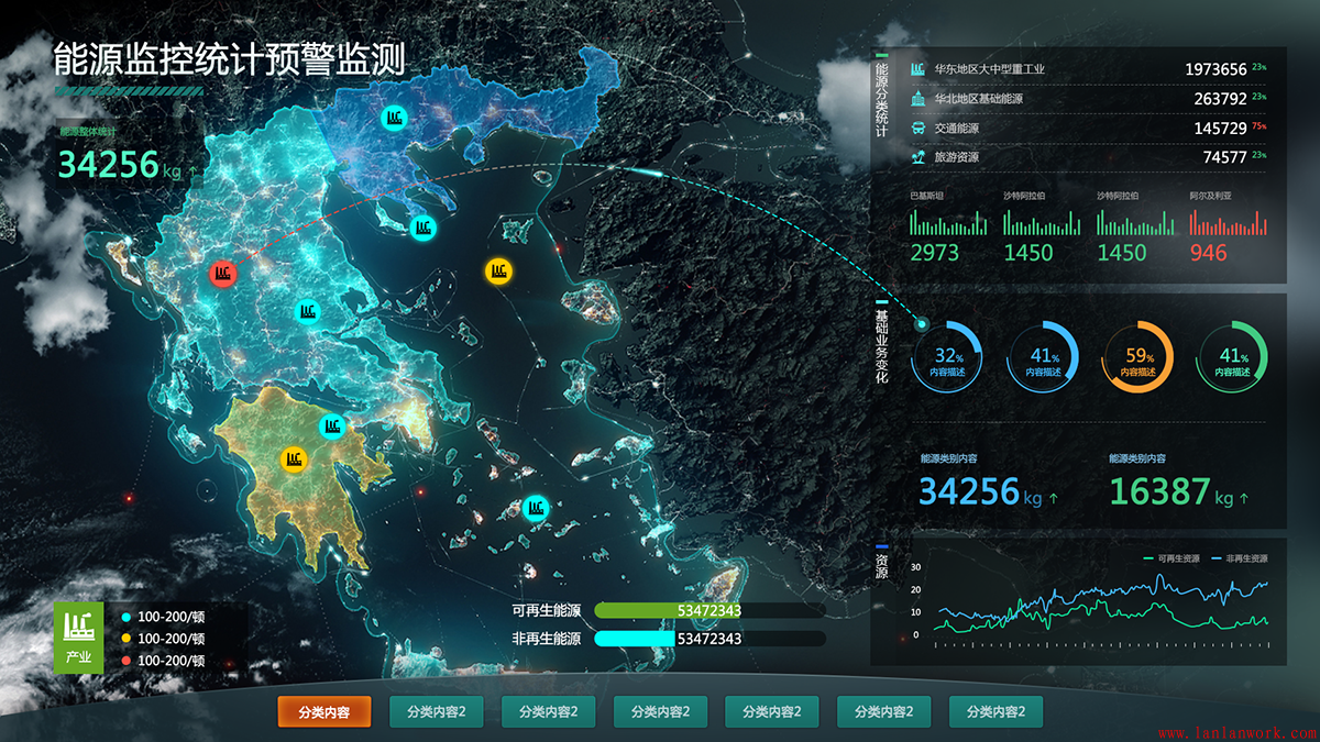 大屏可視化界面設計可謂是當今行業(yè)、企業(yè)發(fā)展的見證,生動直觀地再現(xiàn)了行業(yè)、企業(yè)的全貌。不僅作為展示,方便了解、監(jiān)督;同時可以作為一個有效的管理平臺,帶來效益。大屏界面面向范圍廣,協(xié)同性好,易于被采用。下面幾個大屏的界面設計,沉穩(wěn)的背景上,加上亮色作為點綴和強調(diào)。既不失其風格,又富有靈動性。