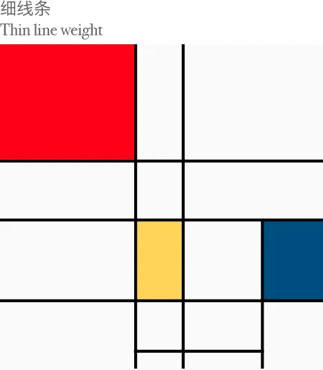 serif字體本身的線條的粗細(xì)變化和平衡就跟中國書法一樣,好的書法作品是不可能每條線都一樣粗細(xì),一定是交織的平衡。人類的視覺本身對不同線寬的交錯就有著美的感覺。比如下圖最左邊是蒙德里安在”新造形主義”﹝Neo-Plasticism﹞里的作品,其中每個交叉的線條都有著不同的粗細(xì)。如果將同樣這幅畫的線條變成同等粗細(xì),那這件作品的性格就淡了。同樣根據(jù)人自然的審美觀,細(xì)線條比粗線條要美,比較第二和第三張就能看出來