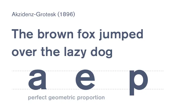 Akzidenz-Grotesk 起于1896年,受到很多字體的影響,從Baskerville, Garamond和Carlson中繼承了幾何比例的影響,將其發(fā)展到了新的一級。當(dāng)代的Akzidenz-Grotesk字體遺傳于20世紀(jì)50年代后期,它已經(jīng)是被擴大后的字體族,這些風(fēng)格到后來啟發(fā)了更加現(xiàn)代的Helvetica,和Univers。