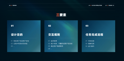 這里說的三要素分別為 設(shè)計(jì)目的、交互規(guī)則、完成任務(wù)過程。(三要素的定義說明都以簡(jiǎn)單化的去舉例,主要展示整體的思維方法)