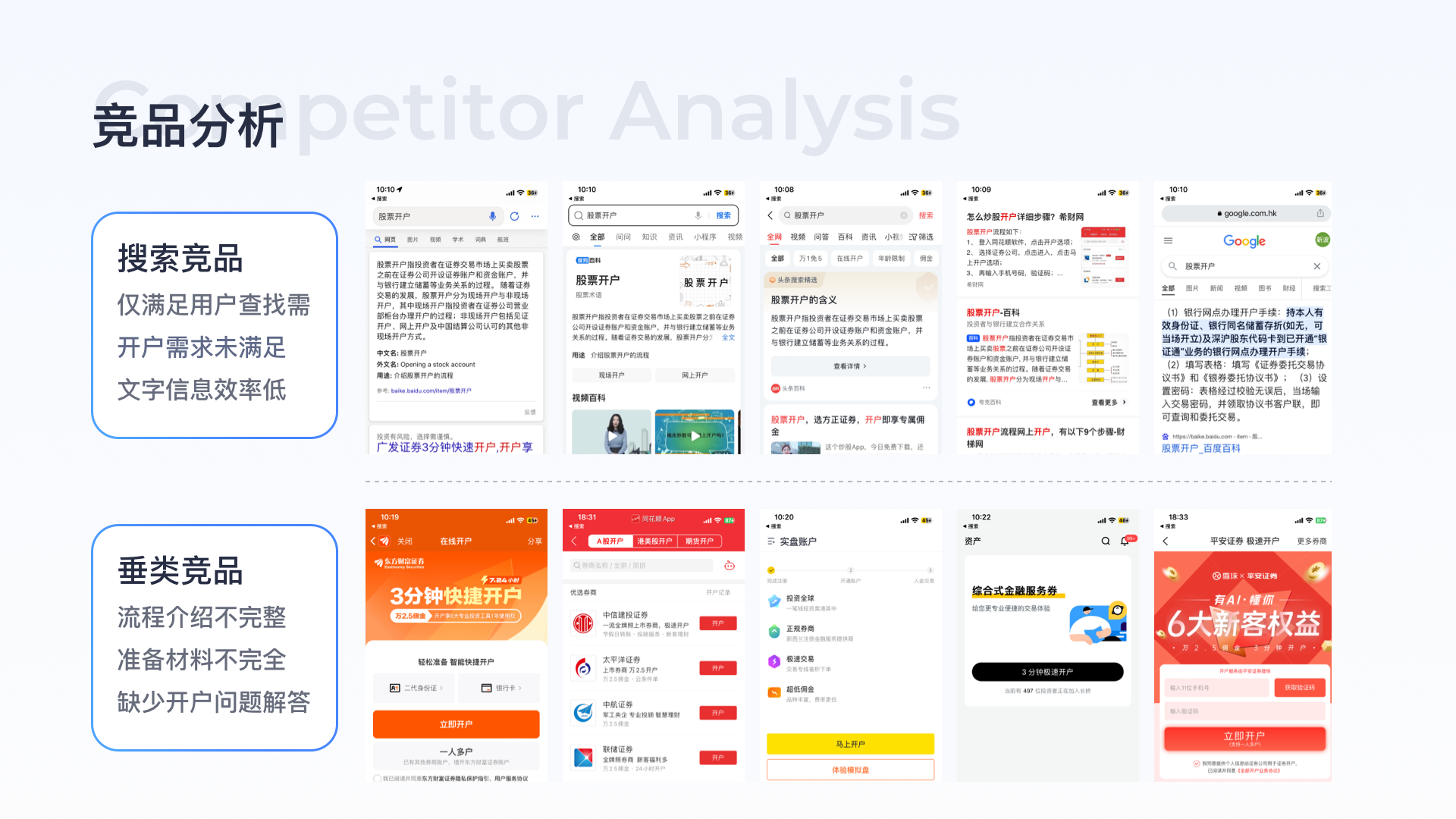 競品分析:搜索競品包括今日頭條、夸克、QQ瀏覽器、必應、谷歌均以滿足用戶查找需求為主,信息以純文本形式展現,消費成本較高,且未滿足用戶潛在的開戶需求,垂類競品開戶頁對流程、材料介紹均不完整、缺少完整的介紹及問題解答。