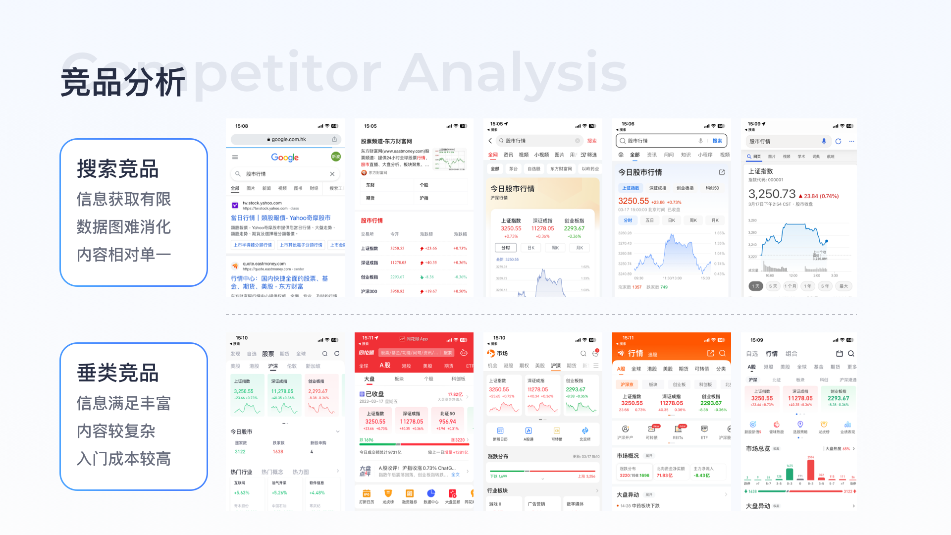 設計優化思路:結合競品優劣勢可得出,需要在提高信息豐富度的同時,考慮小白用戶的入門成本,用更可視化及簡潔的設計語言輔助用戶快速獲取有效需求信息。