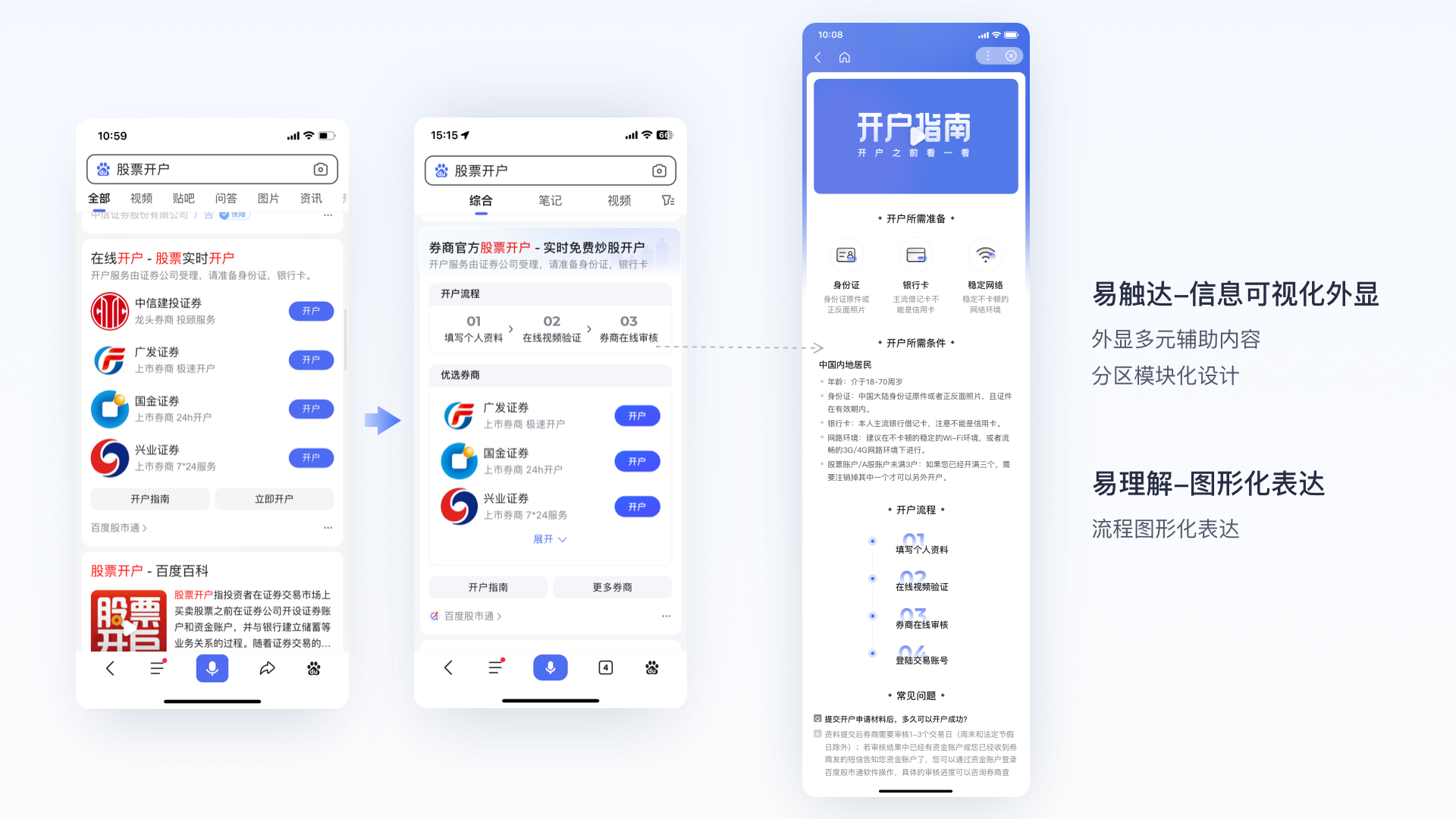 策略設計 :結合用戶需求優先級對信息模塊進行分區,可視化外顯優先滿足開戶流程需求,再提供優質券商開戶入口,考慮到搜索結果頁卡片展示屏效,完整開戶指南配合在落地頁內呈現。