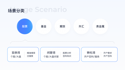 不同場景下用戶需求不同,設計解決方案會有差異,金融品類需求豐富包括股票/基金/期貨/外匯/貴金屬,需求類型包括實體需求/問答需求/轉化需求,需通過數據分析了解各類需求占比,可以作為后續優化優先級的判斷指標,經過數據分析后得出結論股票品類需求及用戶占比遠高于其他品類,以股票品類舉例細化用戶需求,列舉搜索詞,便于后續進行線上問題走查挖掘設計機會點。