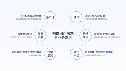 用戶需求:結合用戶高頻使用功能分析發現小白用戶、一般散戶、專業用戶均對行情功能有高頻率的使用需求,具體需求包括了解多市場、關鍵指數行情、了解最新快訊、重要行情動態、盤前/盤中/盤后簡報,再結合小白用戶占比高且對百科內容有需求的現狀,知識科普信息也是相關待滿足需求。