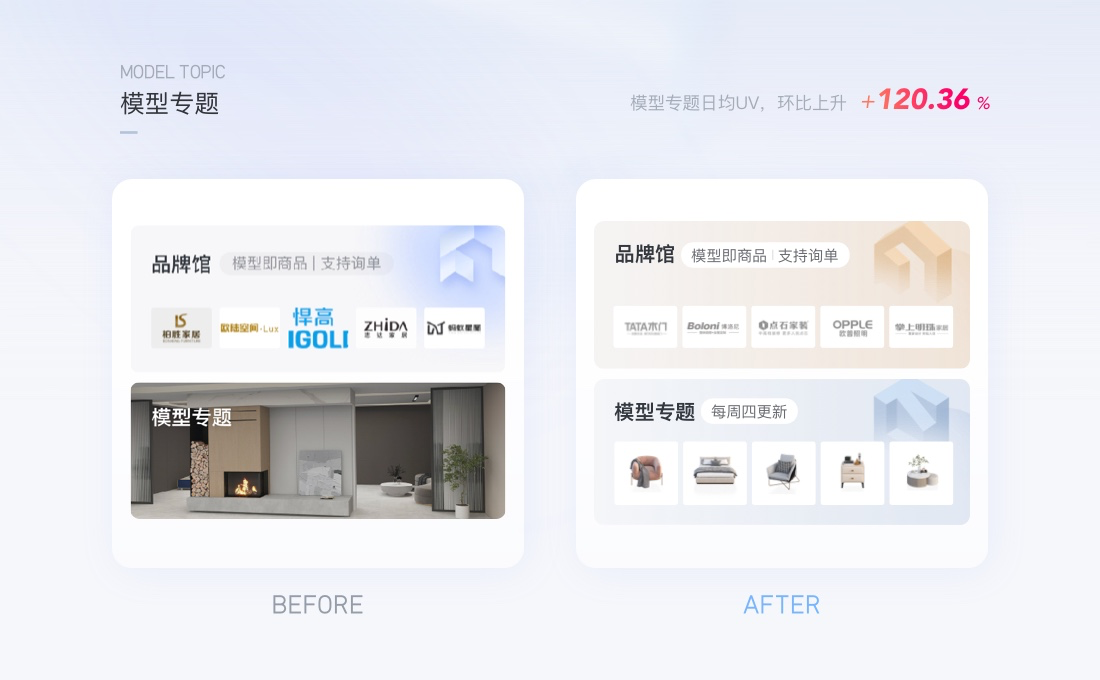 群核下的設(shè)計工具,以專題化的形式聚類商家、平臺推薦的模型是基本的運(yùn)營動作,如下圖,原本以真實(shí)效果圖的方式展示模型專題,用戶難以感知是方案還是模型。通過封面圖形的優(yōu)化:將核心的模型類型展示出來,用戶能夠預(yù)見里面的內(nèi)容。