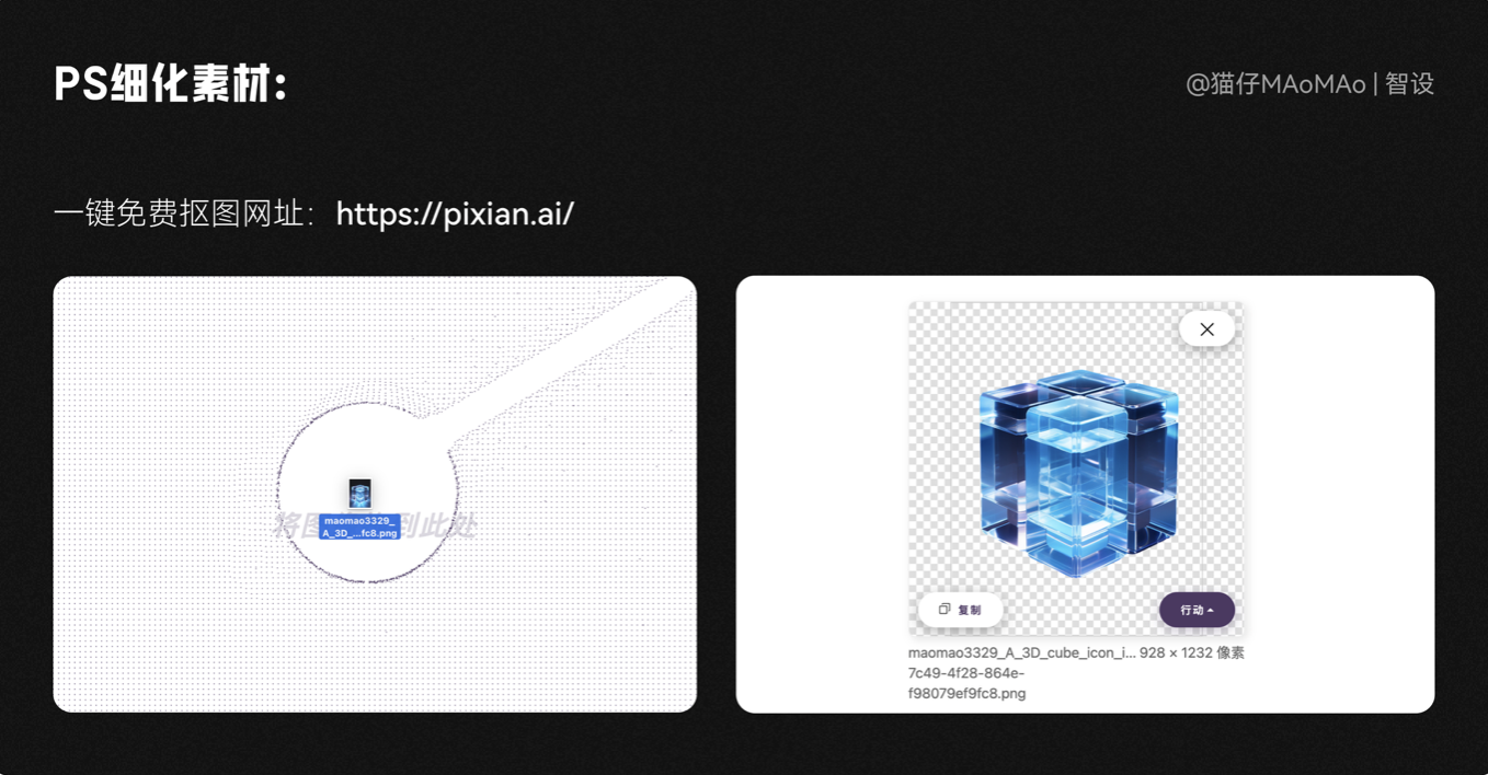 3D主視覺的部分,我們需要先進(jìn)行摳圖,如果不想使用 PS 手動摳圖,這里推薦我常用的一鍵免費(fèi)摳圖網(wǎng)站:https://pixian.ai/ ,處理簡單的圖片,直接把圖片扔進(jìn)去就好了,簡單好用~