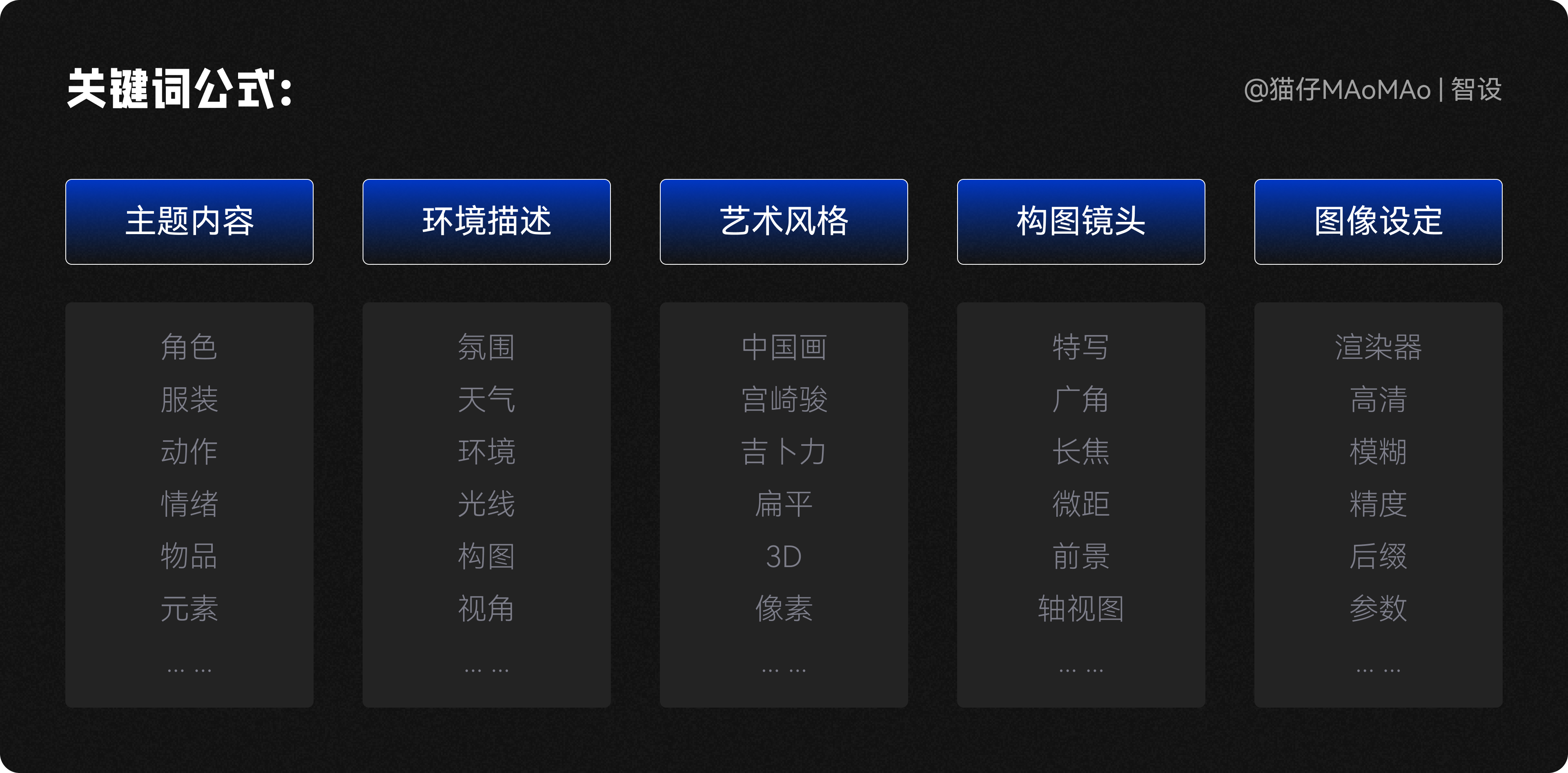 3D主視覺我們采用文生圖的方式制作,寫關(guān)鍵詞的基本公式參考下圖,具體寫關(guān)鍵詞時,需要靈活進(jìn)行增減,然后不斷嘗試,直到出現(xiàn)自己滿意的效果。