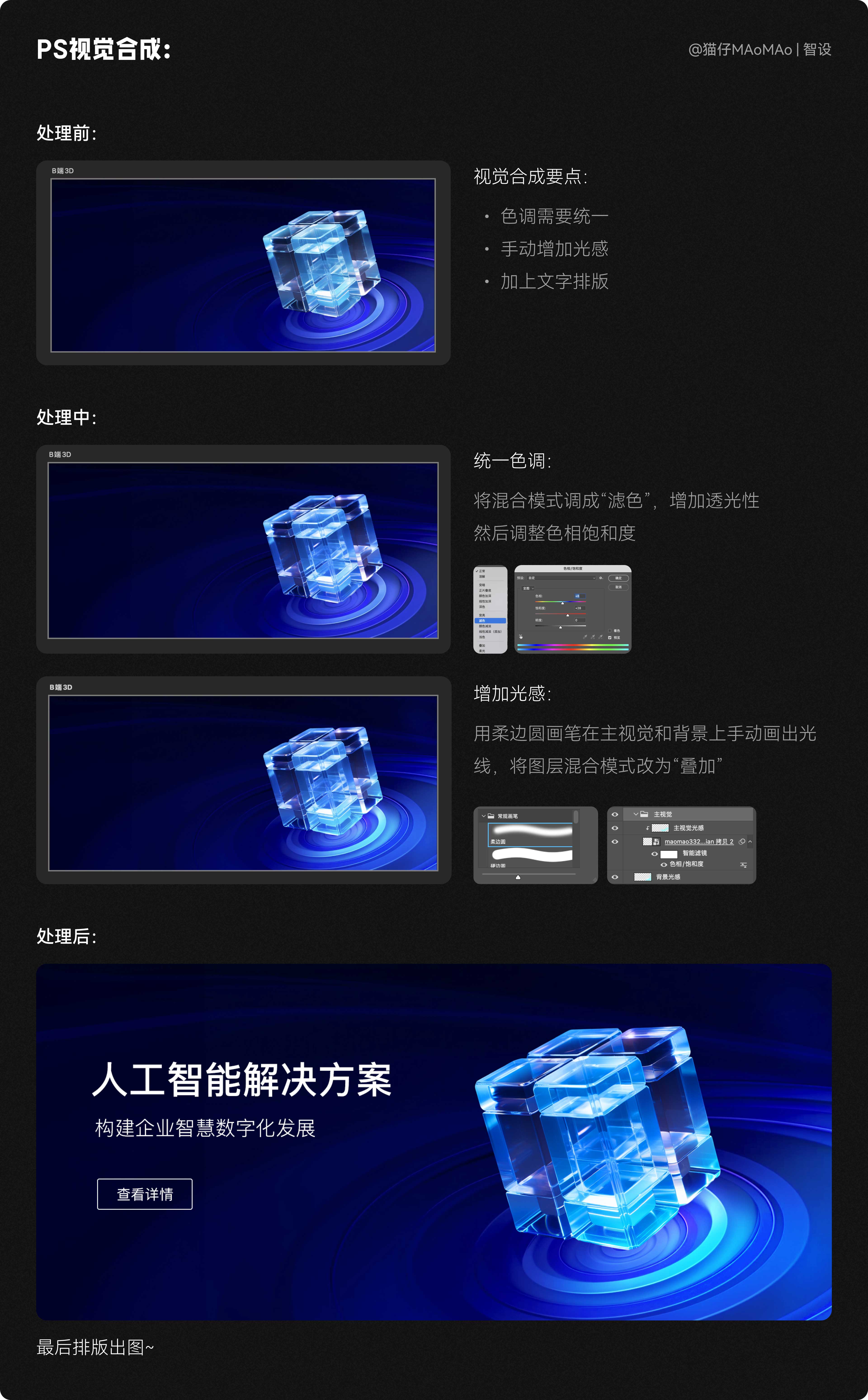 這一步考驗的是設(shè)計師的審美和手活,我們需要把背景和主視覺素材,進(jìn)行視覺合成,其實也非常簡單:這里我定的主要色調(diào)是藍(lán)色+青色的光感,首先需要將色調(diào)整體統(tǒng)一;然后想要表現(xiàn)出玻璃質(zhì)感的通透,我們需要加上一些光感;最后文字排版出圖即可~