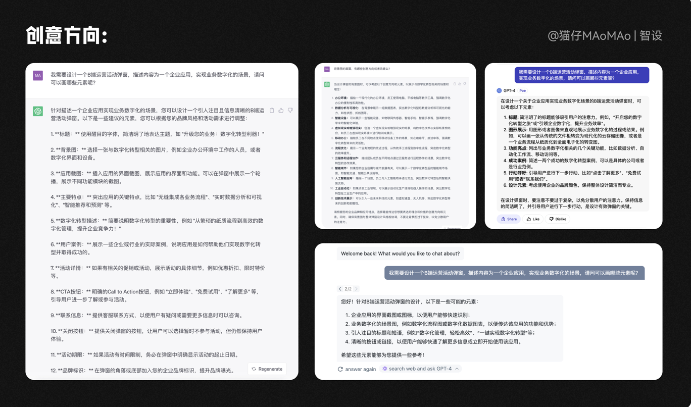 在沒有設(shè)計方向的時候,不妨讓AI大語言模型來幫助我們,它會根據(jù)需求的業(yè)務(wù)場景,給出合理的內(nèi)容建議,以及畫面元素的建議。