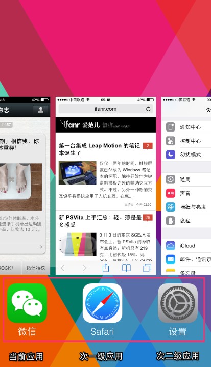 新的多任務界面依然是通過雙擊 Home 鍵觸發,但無論界面和使用方式,和上一代系統已有了本質的區別。