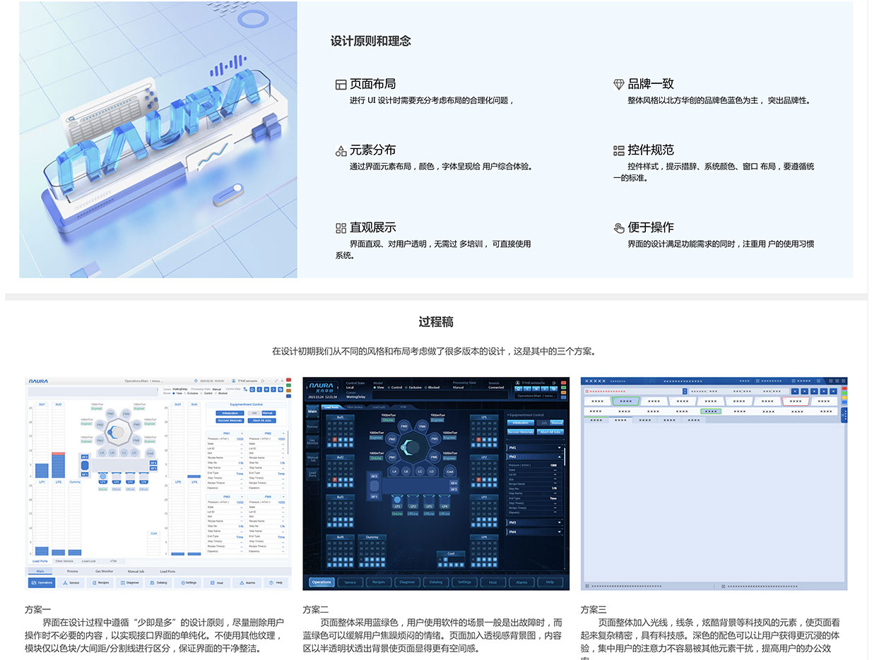 品牌一致:整體風(fēng)格以北方華創(chuàng)的品牌色藍(lán)色為主, 突出品牌性。