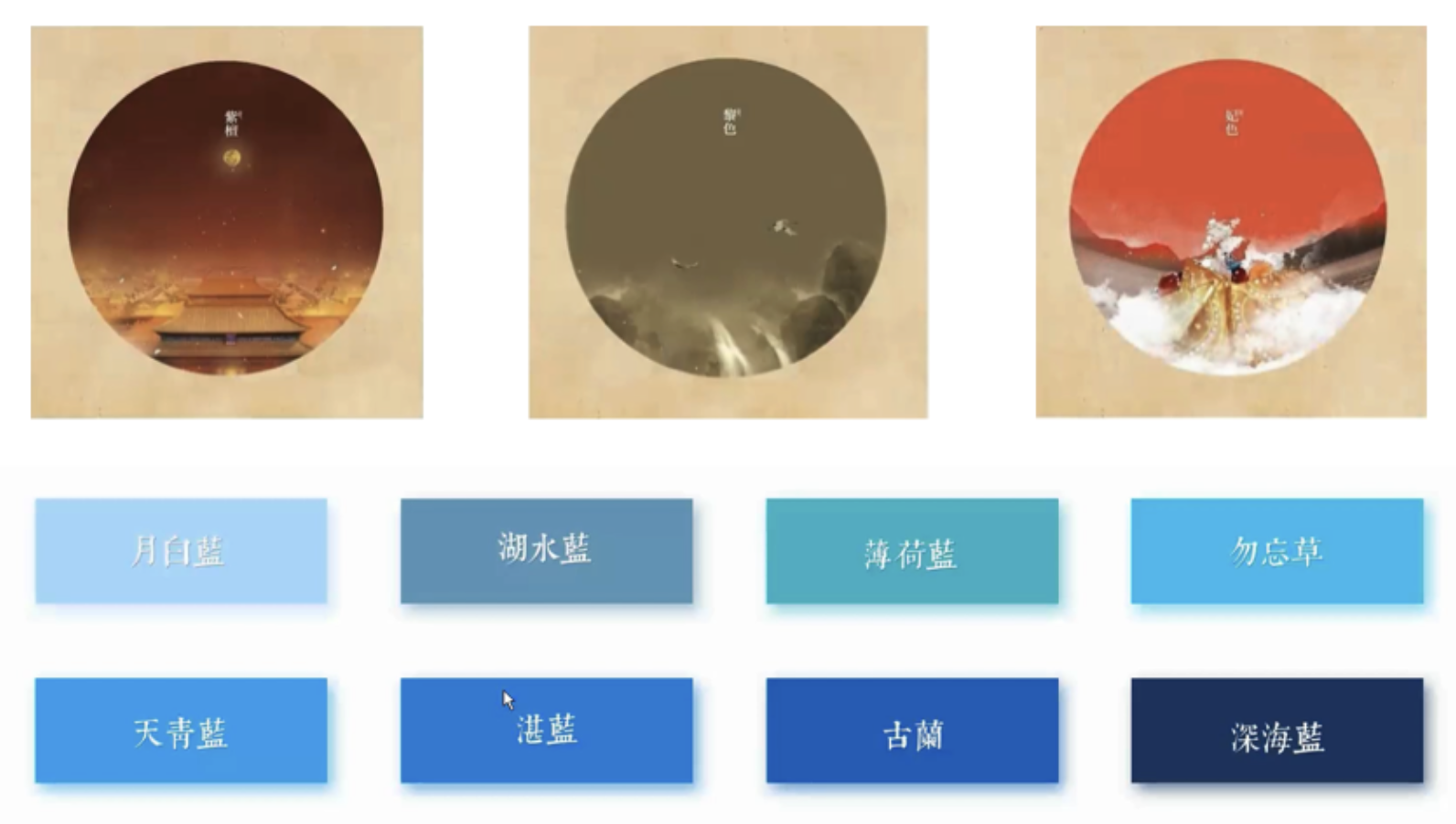 • 中國風(fēng)色彩示例:月白藍(lán)、湖水藍(lán)、勿忘草、天青藍(lán)、薄荷藍(lán)、洪藍(lán)、古蘭、深海藍(lán)。