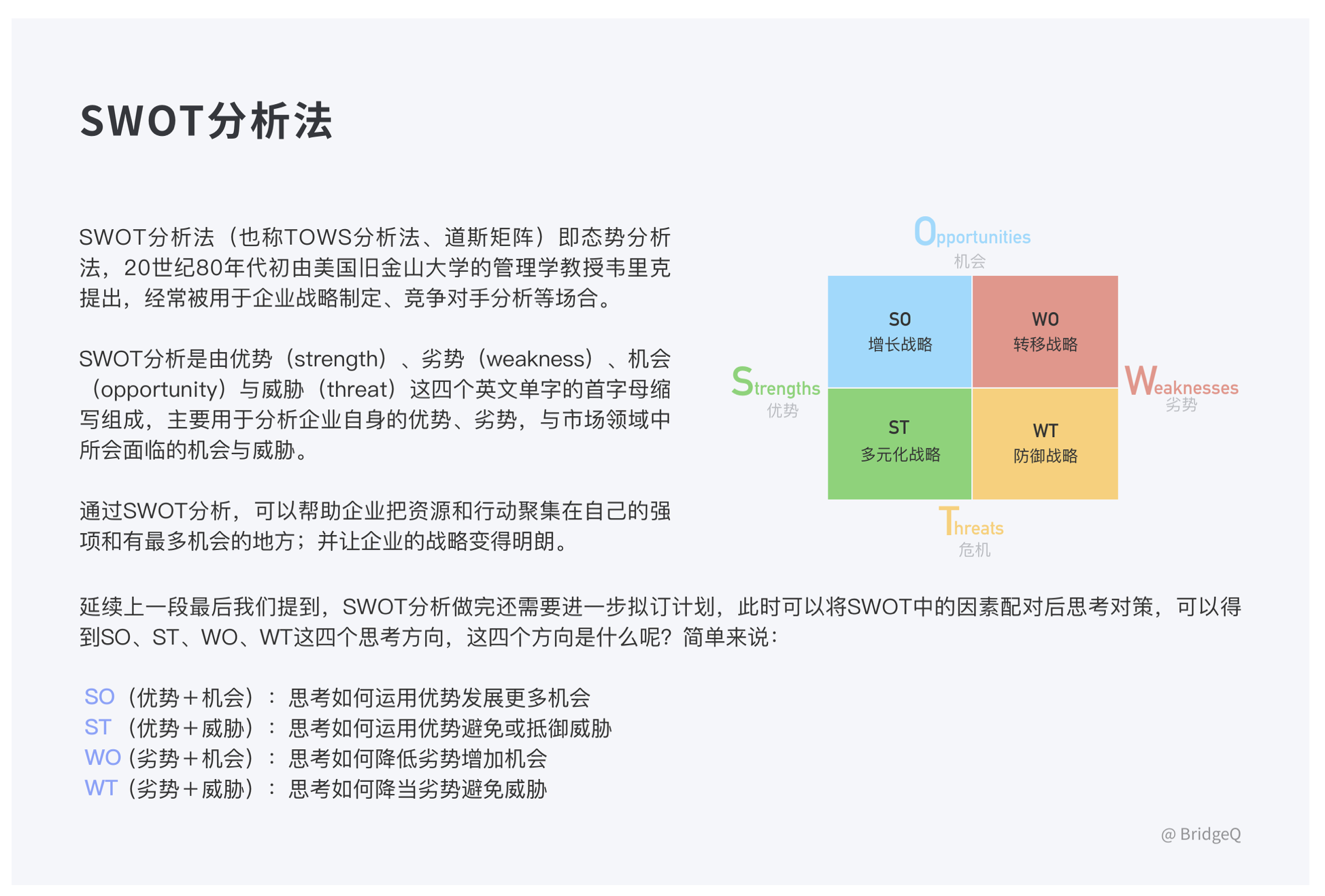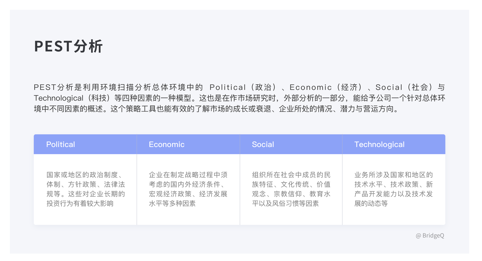 • 方法:PEST(宏觀環境)、波特五力模型(競爭態勢)、SWOT 分析(優劣勢)。