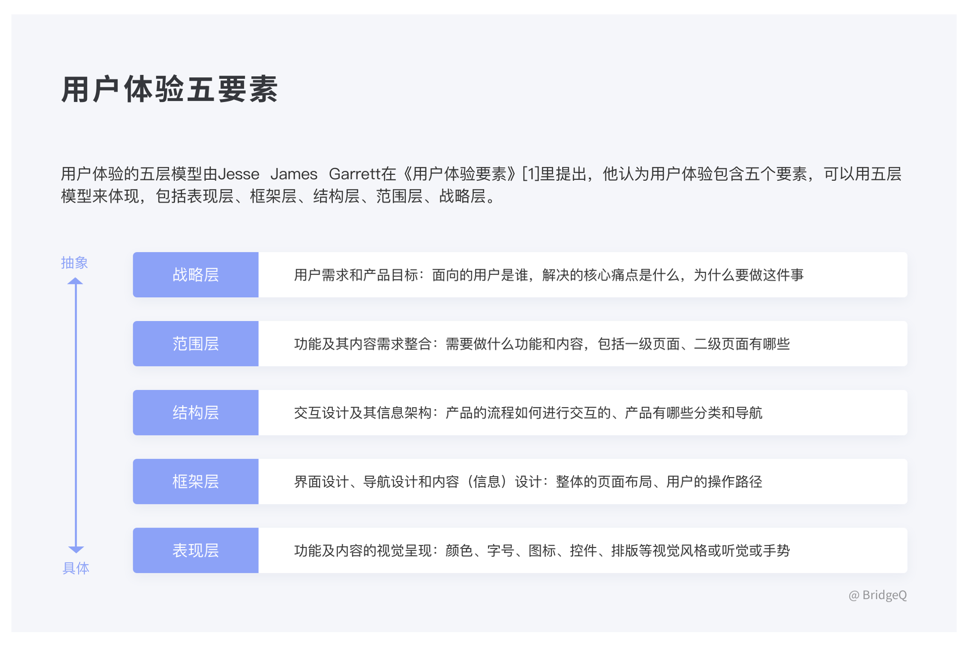 • 核心方法:用戶體驗五要素(戰略層、范圍層、結構層、框架層、表現層)。