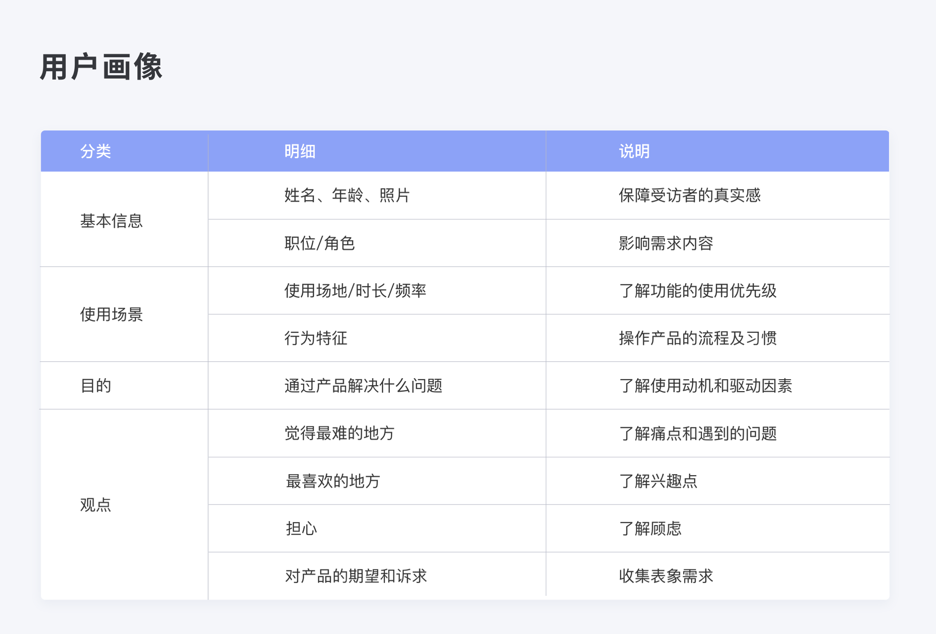 • C 端要素:基本信息、使用場景、痛點、期望;B 端要素:行業特征、公司規模、業務需求。