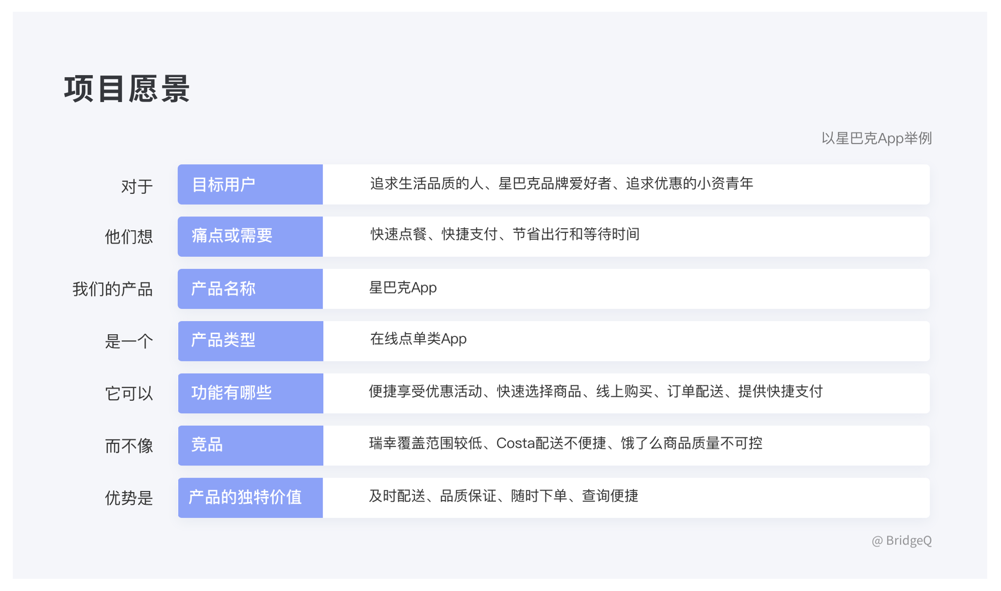 • 核心內容:目標用戶、痛點、產品定位、功能價值、競品差異、獨特優勢,需簡潔且突出重點。