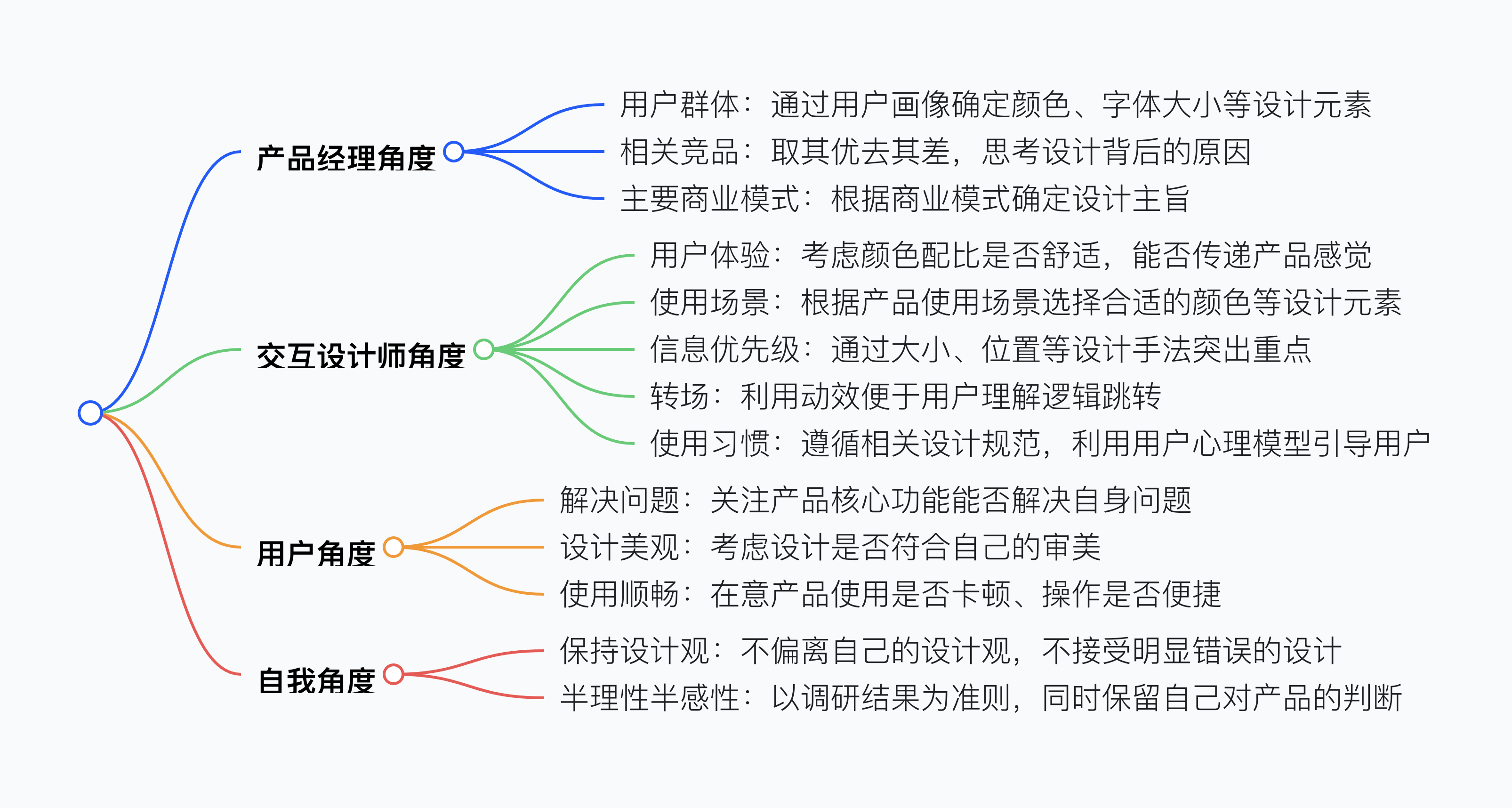 UI 設(shè)計需從產(chǎn)品經(jīng)理、交互設(shè)計師、用戶和自我這 4 個角度思考:像產(chǎn)品經(jīng)理一樣關(guān)注用戶群體、相關(guān)競品、主要商業(yè)模式;像交互設(shè)計師一樣考慮用戶體驗、使用場景、信息優(yōu)先級、轉(zhuǎn)場、使用習慣;像用戶一樣思考產(chǎn)品能否解決問題、設(shè)計是否美觀、使用是否順暢;像自己一樣保持設(shè)計觀,不盲目接受錯誤設(shè)計。如此才能做出符合用戶需求且有自己韻味的設(shè)計。