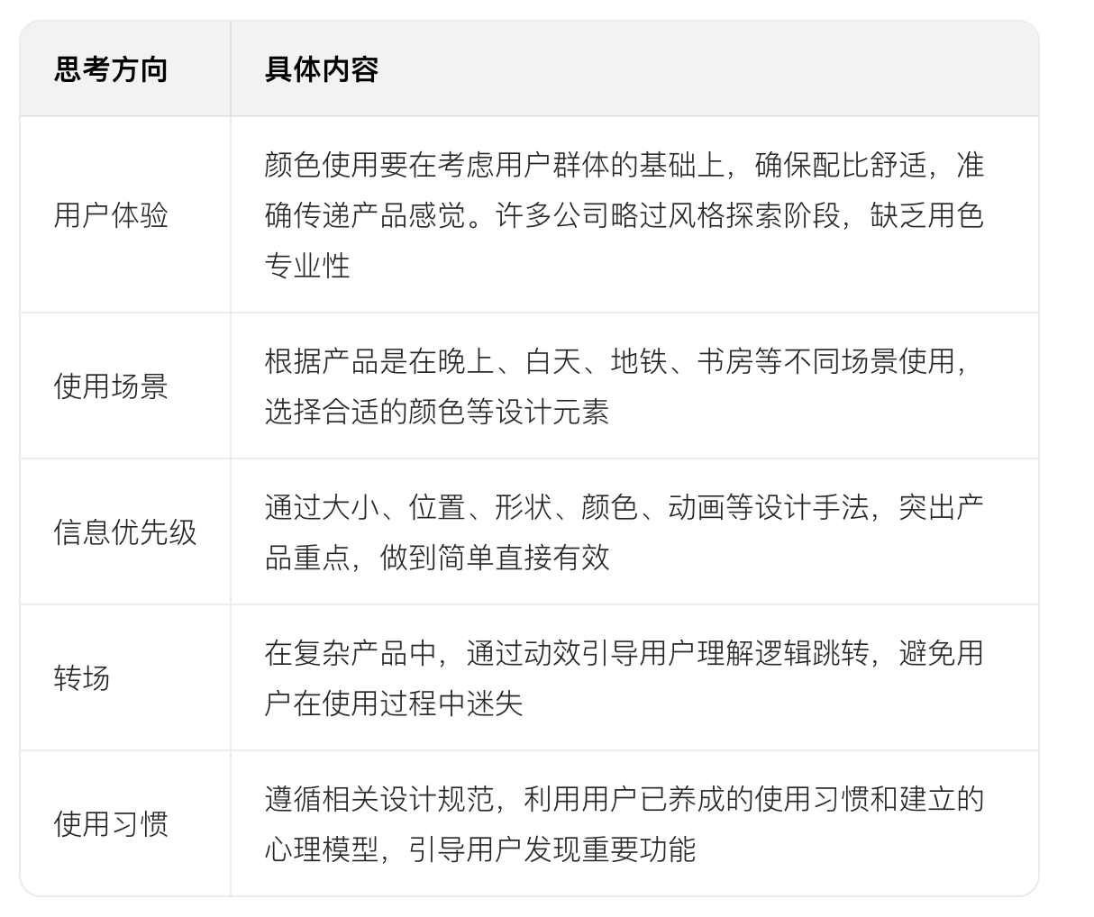 • 答案:交互設(shè)計師角度的思考包括用戶體驗、使用場景、信息優(yōu)先級、轉(zhuǎn)場、使用習慣等方面。在用戶體驗上,影響顏色配比的舒適性和對產(chǎn)品感覺的傳遞;在使用場景上,決定設(shè)計元素是否符合產(chǎn)品使用環(huán)境;在信息優(yōu)先級上,指導如何通過設(shè)計手法突出重點;在轉(zhuǎn)場上,幫助用戶理解邏輯跳轉(zhuǎn);在使用習慣上,利用用戶心理模型引導操作,這些都能提升 UI 設(shè)計的實用性和用戶體驗。