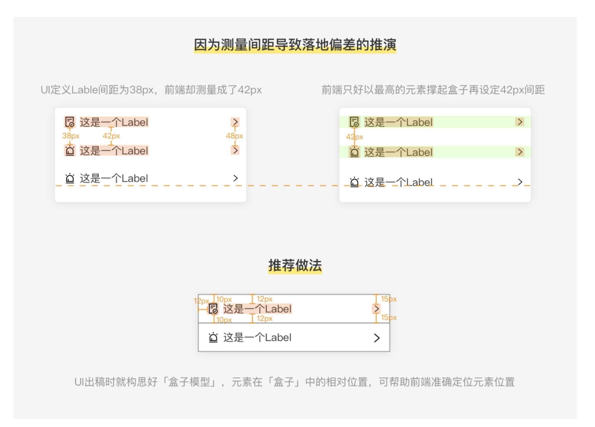 • 答案:盒子模型是前端基礎知識,前端將元素視為盒子布局。UI 出稿帶入盒子模型思維,合理構思元素在盒子中的相對位置,一方面能讓自己輸出頁面時布局更合理,另一方面可輔助前端準確還原,避免因測量間距方式不同導致落地偏差,如表單設計中 UI 定義 Label 間距為 38px,前端若不按盒子模型可能測量成 42px,按盒子模型則能準確定位。
