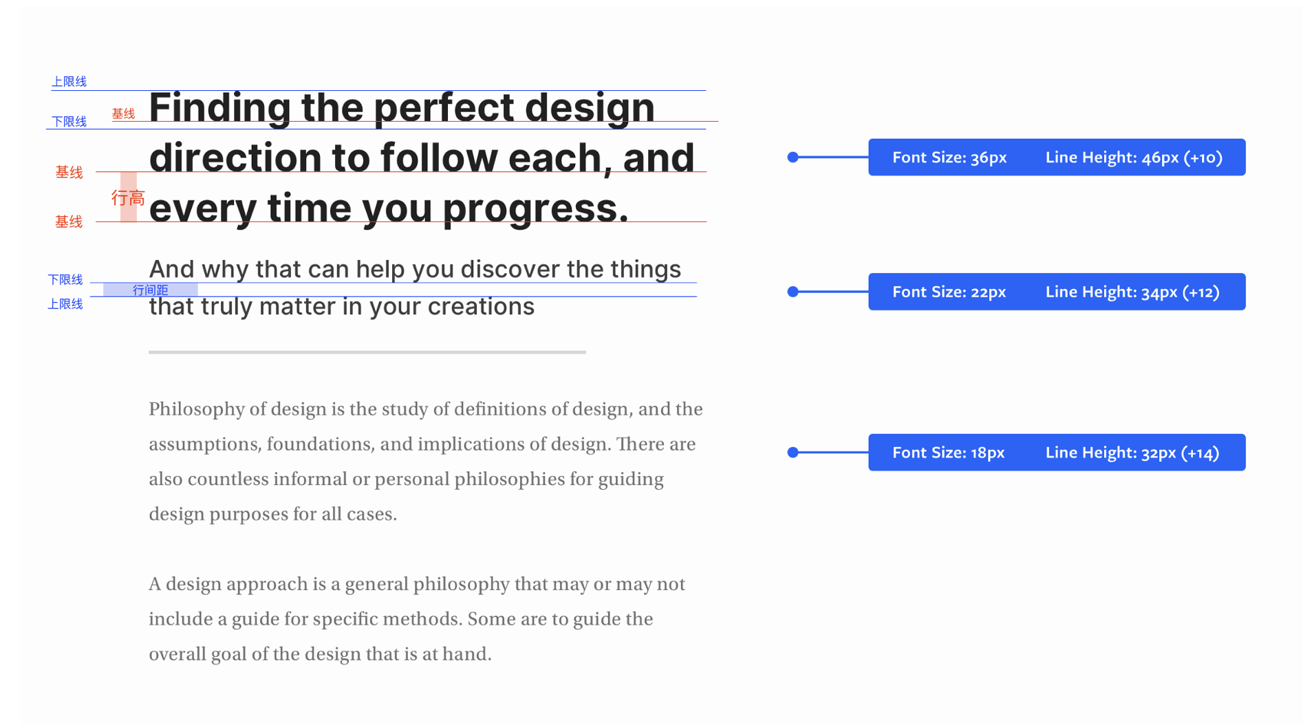 • 搭配字體與行高:字體越小,增大行高可提升可讀性和易讀性。其中,英文的行高是指上一行的基線到下一行基線之間的距離;行間距則是上一行的下限線與下一行的上限線之間的距離,二者需注意區分。