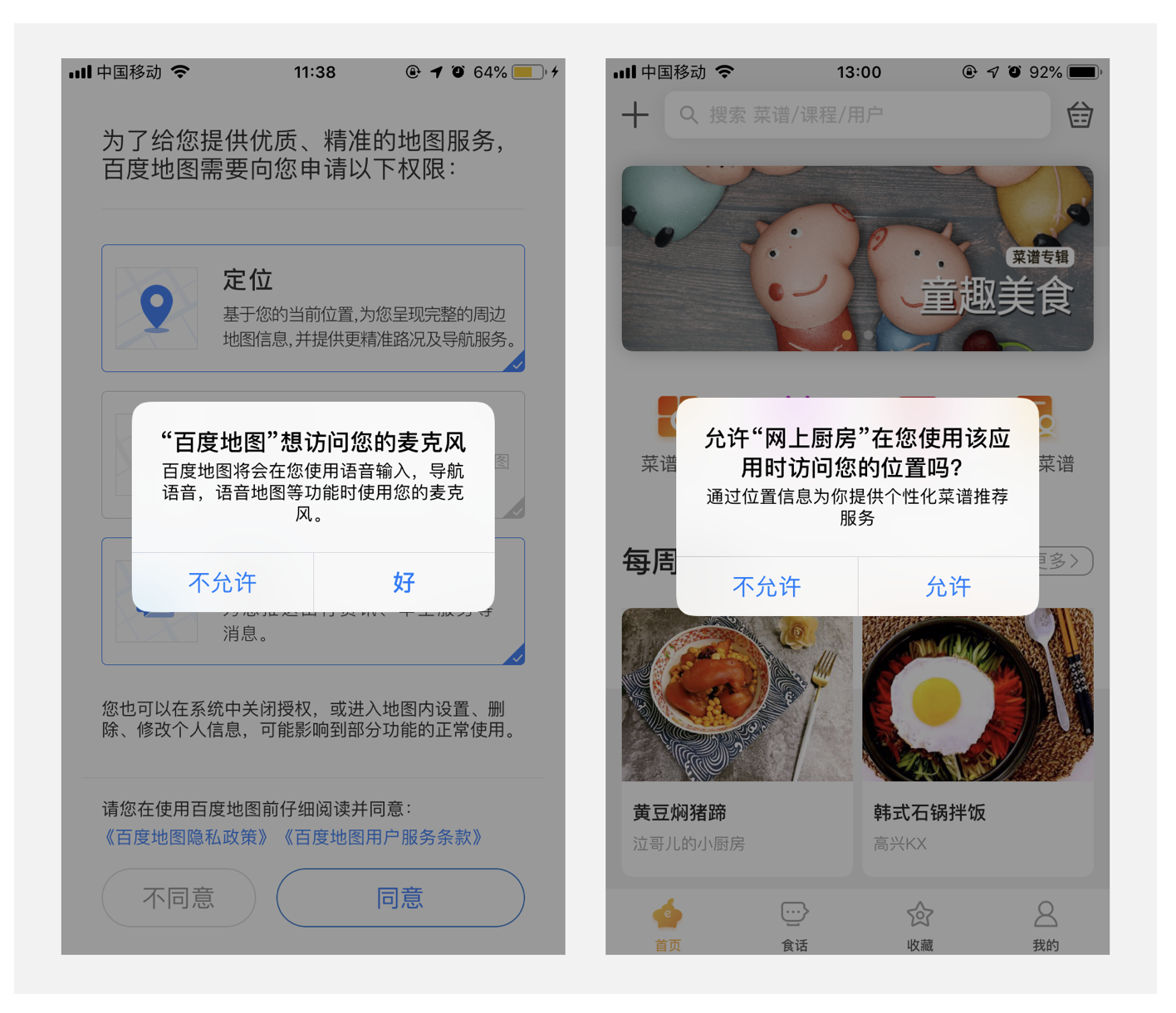 - 系統(tǒng)功能的授權(quán):如 “百度地圖” 申請訪問麥克風、“網(wǎng)上廚房” 申請訪問位置的彈窗,這類屬于系統(tǒng)自帶的授權(quán)彈窗,在許多 APP 中都較為常見。