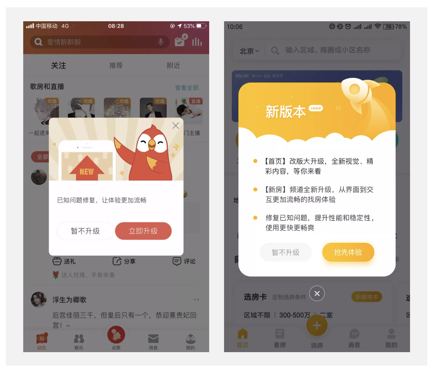 - 版本更新:版本升級彈窗通常會弱化 “暫不升級” 按鈕,突出 “升級” 主按鈕,告知用戶新版本的變化和優(yōu)勢。