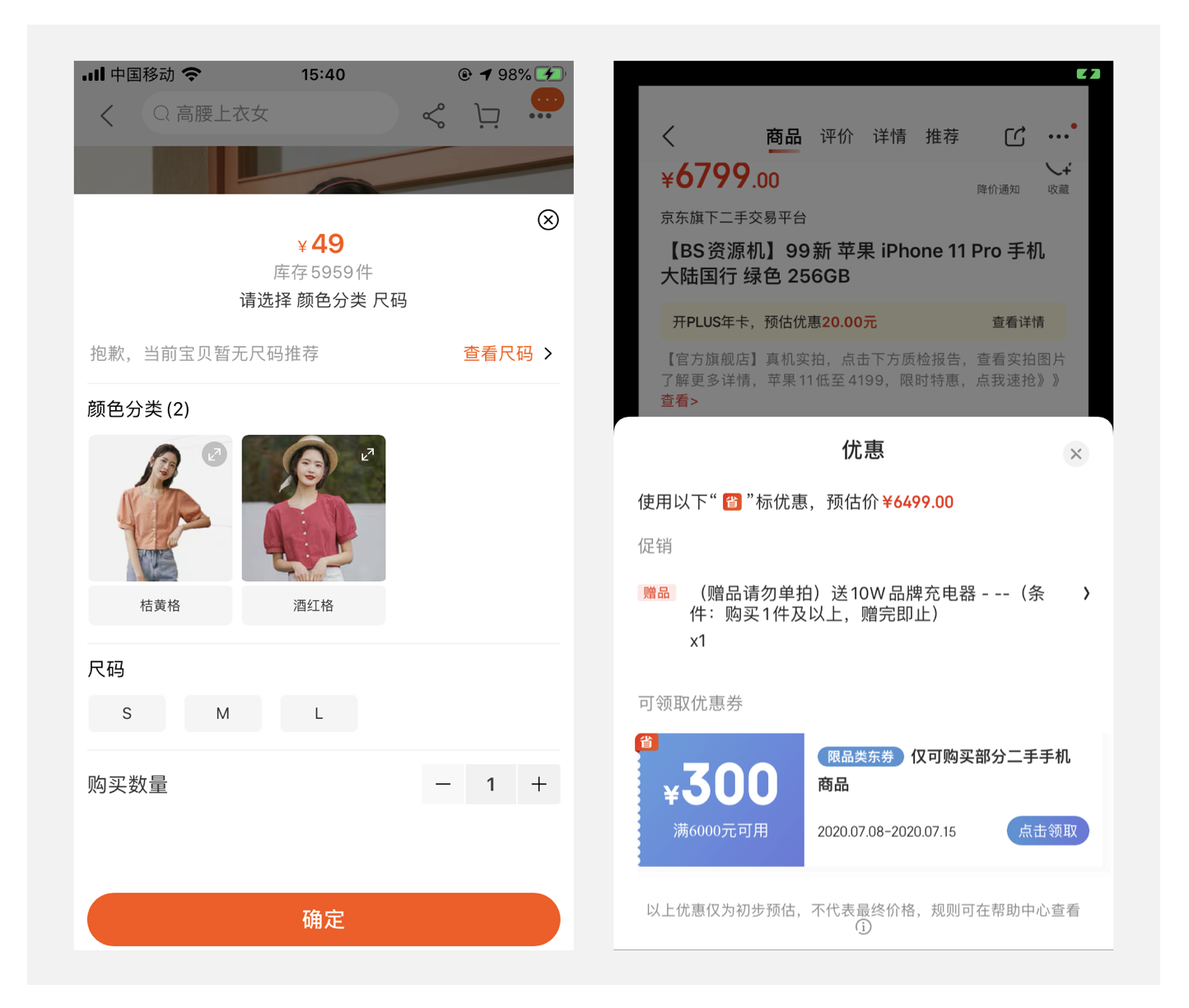 - 半屏彈窗:淘寶和京東的購買頁面彈窗是比較典型的例子,在各種電商產(chǎn)品中應用廣泛,方便用戶選擇商品規(guī)格、數(shù)量等。