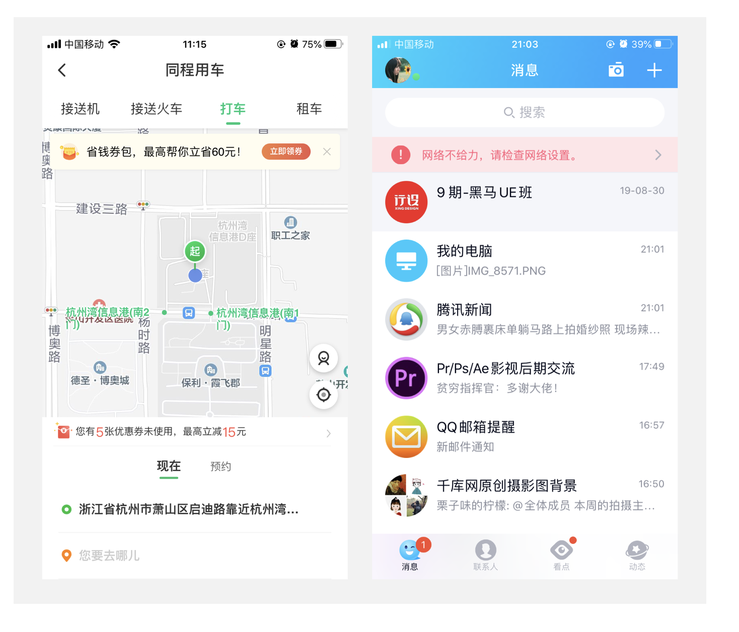 這是 Android 中的一個控件,會超時自動關(guān)閉或者在屏幕上滑動關(guān)閉,出現(xiàn)時間比 Toast 長,且可以點擊按鈕進行交互。如京東的 Snackbar 提示用戶點擊箭頭查看喜歡的商品,為用戶推薦商品,并有關(guān)閉按鈕;酷狗音樂的 Snackbar 給用戶提供開通會員的快捷入口,一直浮于頁面底部,沒有關(guān)閉按鈕;同程用車的領(lǐng)券活動彈窗也屬于此類,是常用的營銷手段;QQ 的斷網(wǎng)提示類似通知條樣式,會浮于頁面上方直到網(wǎng)絡(luò)恢復。