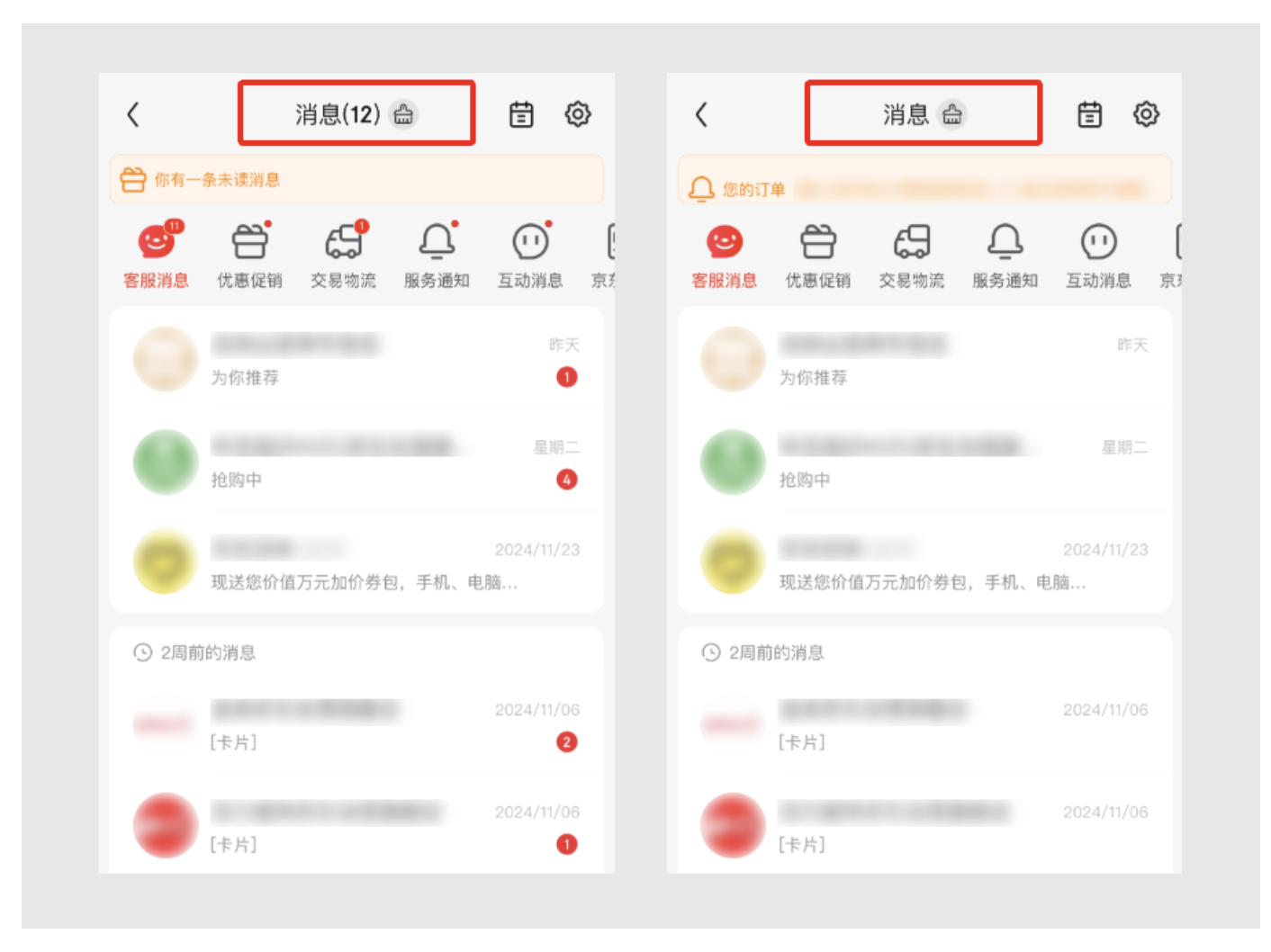 京東的核心用戶是追求效率的年輕人,他們熟悉 “圖標(biāo)語(yǔ)言”,覺(jué)得文字按鈕太啰嗦。所以京東用 “掃把” 圖標(biāo)代替文字,放在消息頁(yè)頂部,像 “掃垃圾” 一樣清理未讀標(biāo)記,簡(jiǎn)潔又符合直覺(jué)。