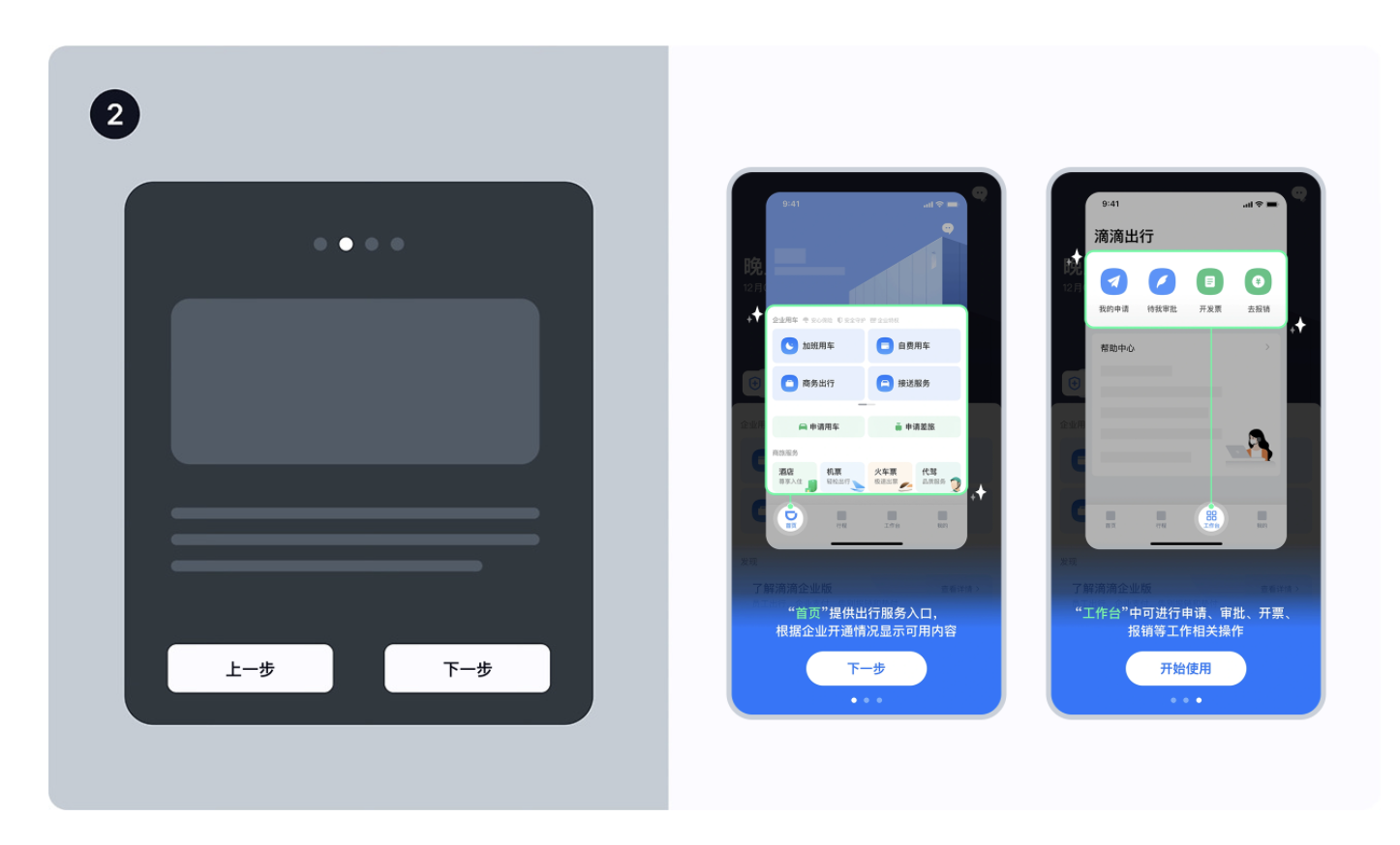 - 例子:滴滴企業版的新手引導,先講 “首頁有出行服務入口”,再講 “工作臺能審批、開票”,每步只傳遞一個信息,用戶不會覺得混亂;