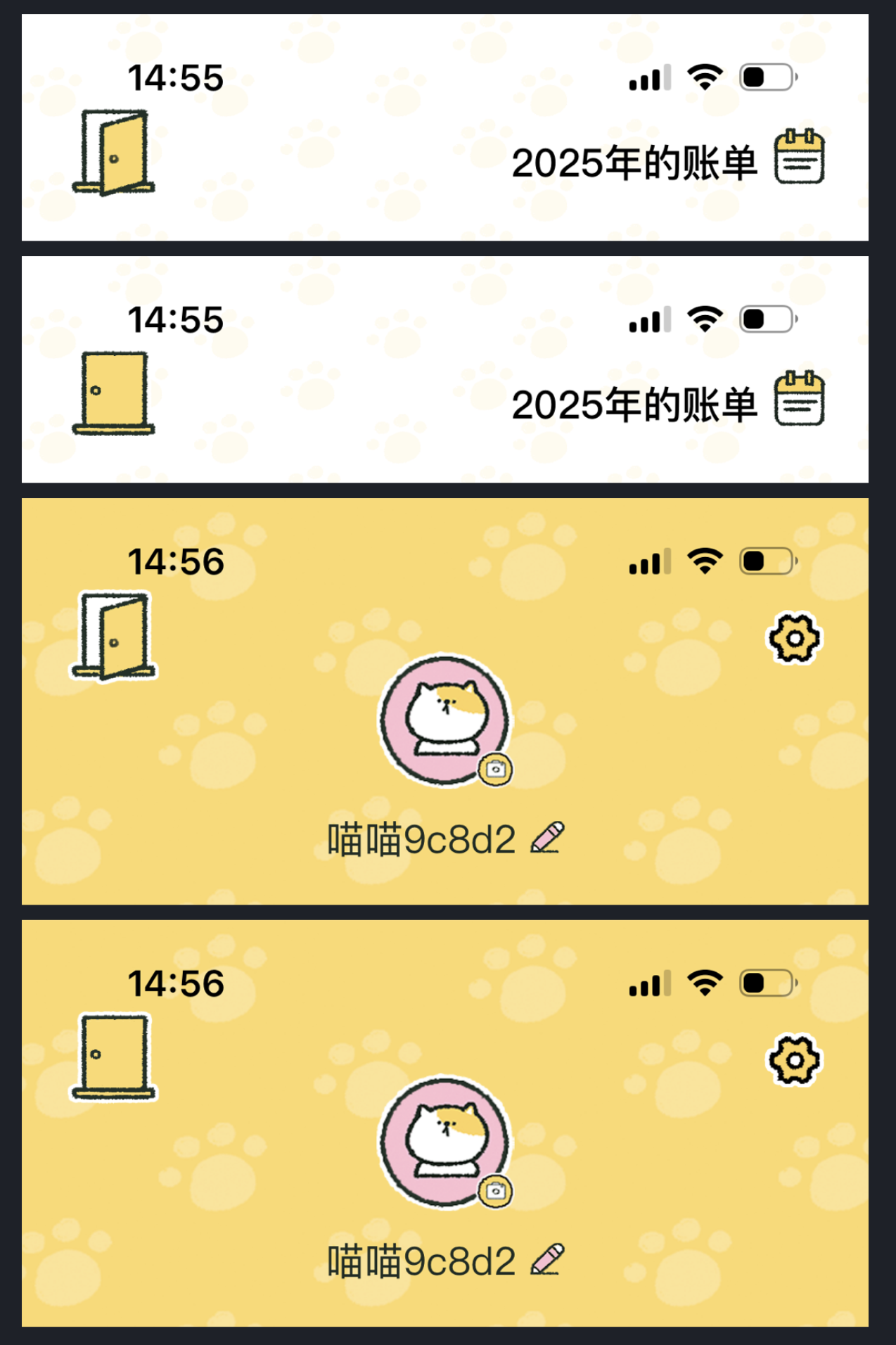 常規返回功能總離不開 “箭頭” 或 “返回” 文字,用戶雖能理解,卻少了點情感共鳴。而喵喵記賬 APP的做法,是把 “層級切換” 轉化為用戶熟悉的生活場景 —— 用 “門” 作為核心元素。