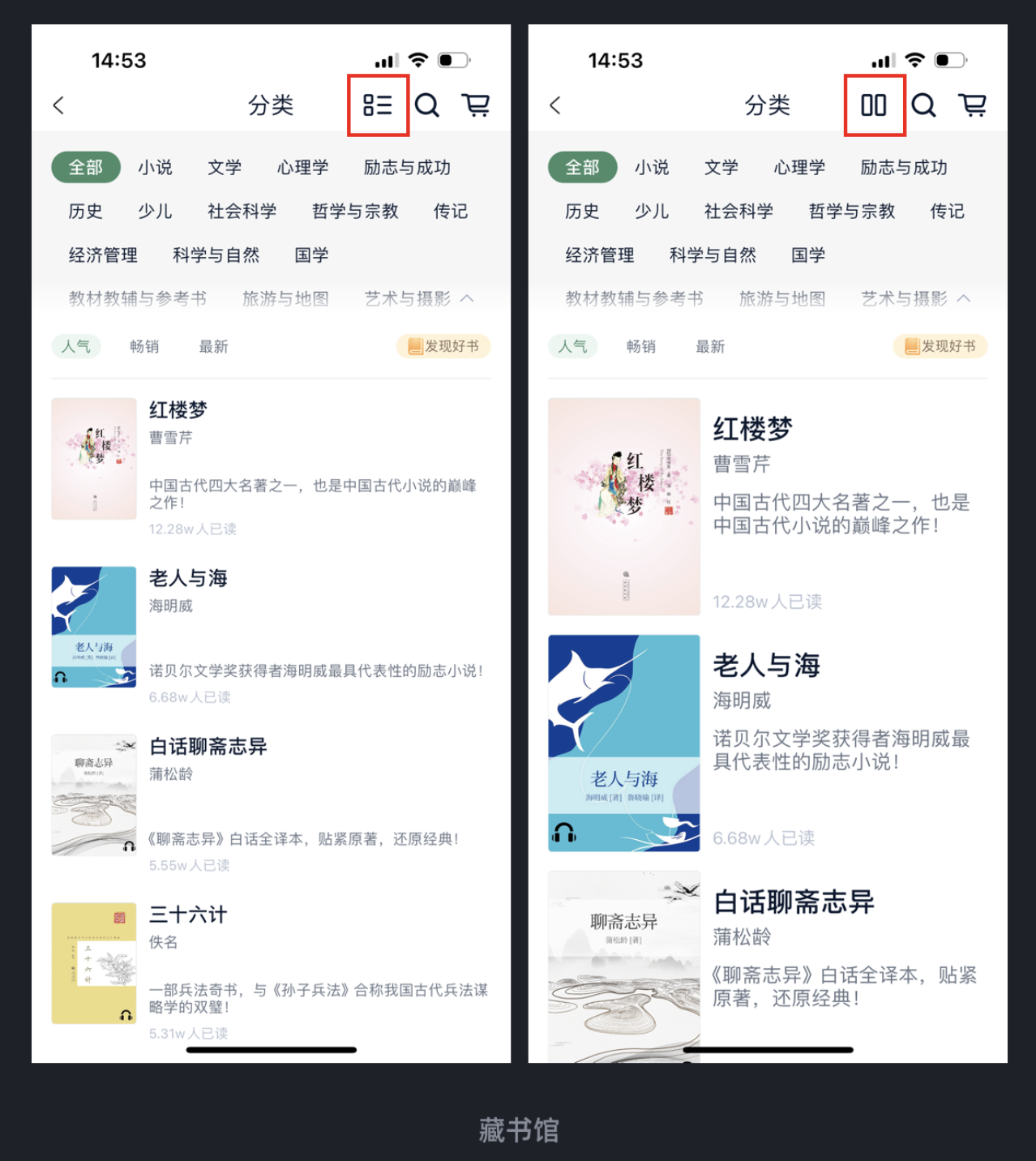 不是所有用戶都喜歡同一種瀏覽方式 —— 有人想快速掃過更多內容,有人則希望看清封面和細節。藏書館 APP在 “書庫分類” 模塊里,就做了 “可切換大小” 的布局設計: