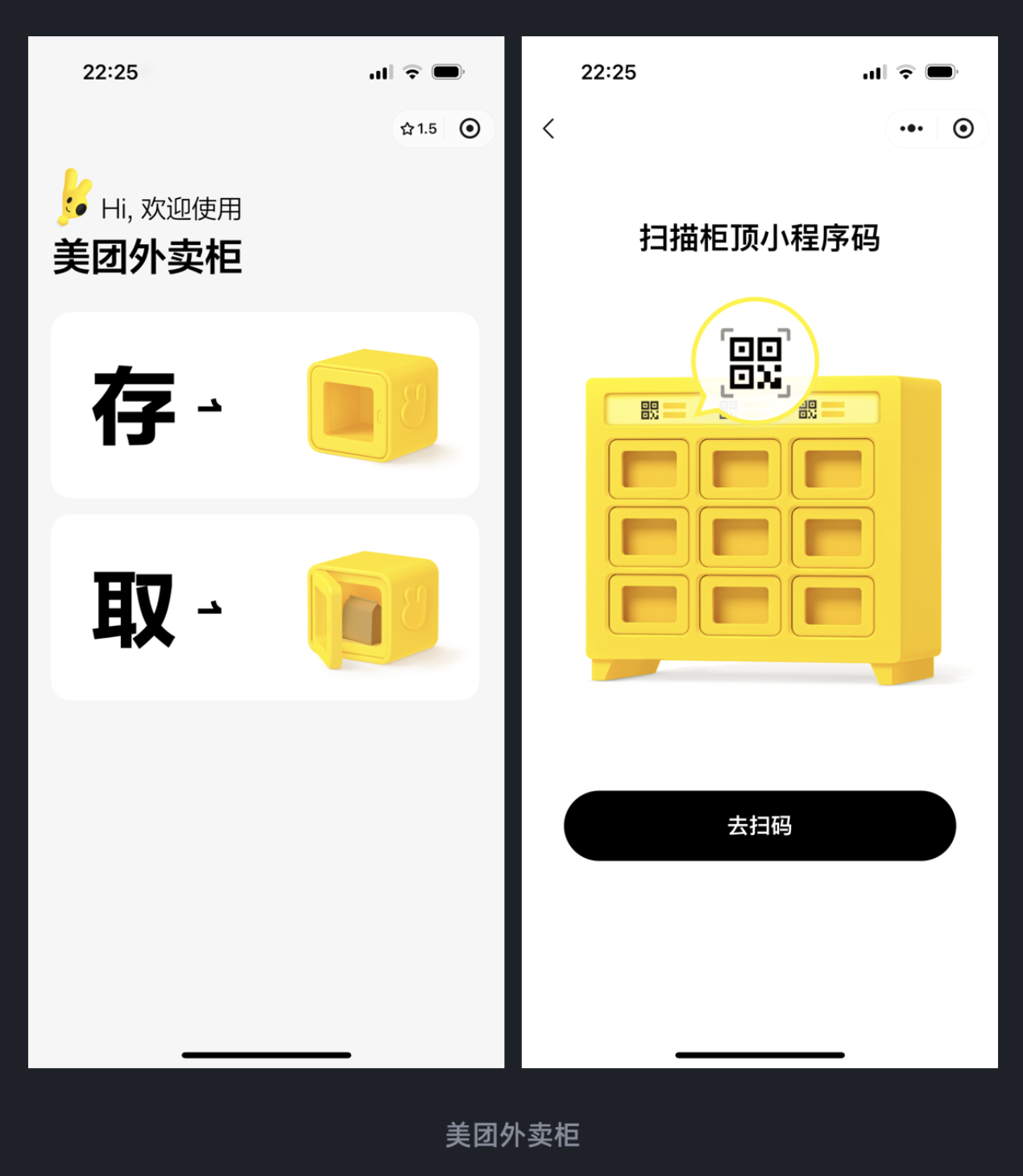 現在很多產品總想著 “多放功能才顯價值”,結果界面雜亂,用戶找不到核心操作。但美團外賣柜小程序卻反其道而行之 —— 打開界面后,只有 “存” 和 “取” 兩個核心按鈕,搭配 “掃描柜頂小程序碼” 的簡單指引,沒有任何廣告、推薦等多余元素。