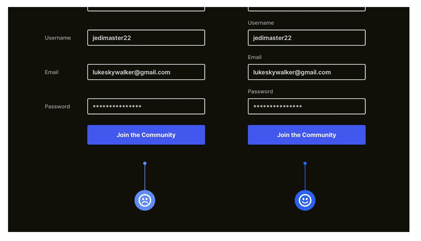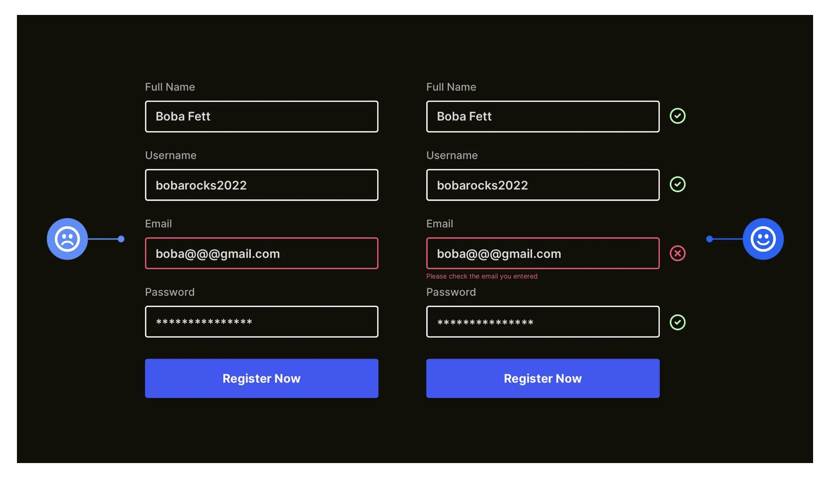 很多產(chǎn)品用 “紅色邊框” 提示表單錯(cuò)誤,但這種設(shè)計(jì)對(duì)色盲用戶無(wú)效 —— 他們無(wú)法分辨 “紅色” 與其他顏色,會(huì)完全忽略錯(cuò)誤提示,導(dǎo)致反復(fù)提交失敗。