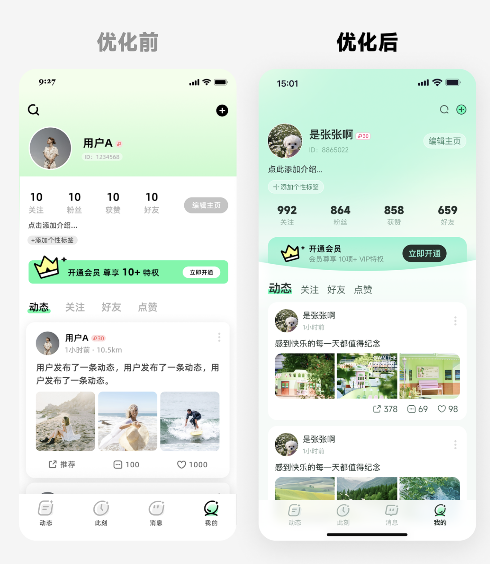 - 數(shù)據(jù)真實化:原版本的 “10 關(guān)注、10 粉絲” 太假,換成 “992 關(guān)注、864 粉絲”,既符合用戶認(rèn)知,又讓數(shù)據(jù)更有說服力。