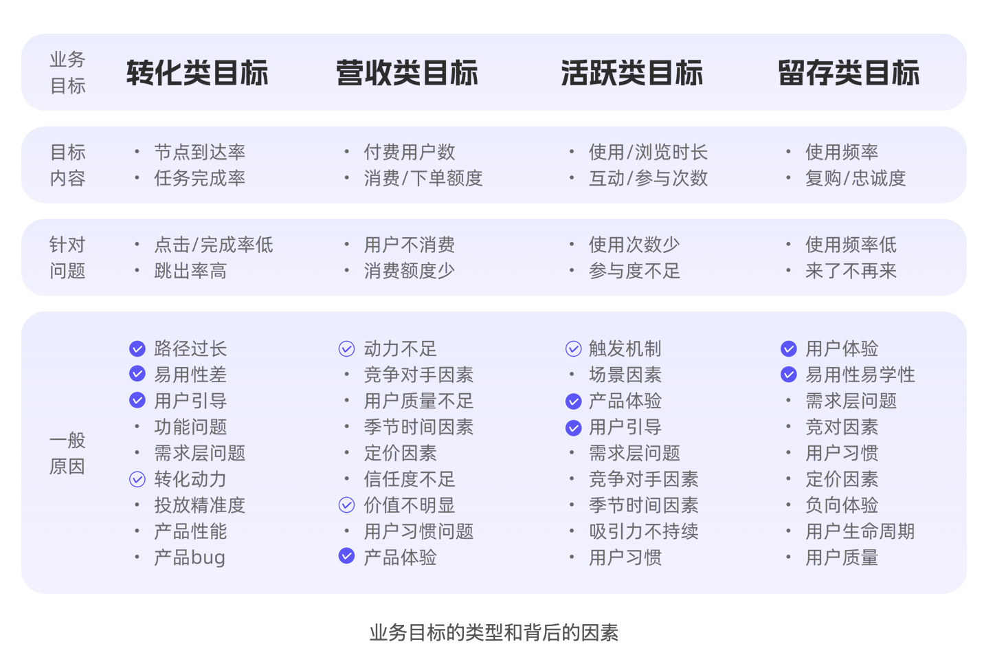 先判斷業(yè)務(wù)目標屬于哪一類,再定位核心痛點。四大類業(yè)務(wù)目標的核心問題的如下:
