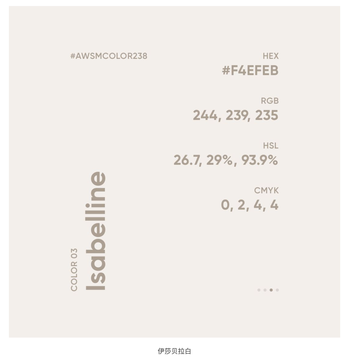 色值 #F4EFEB 的伊莎貝拉白,是介于灰白與淺米色之間的暖調(diào)白色,低飽和度的特質(zhì)讓它自帶一種歲月沉淀的溫潤感。這種顏色的名字源于一個充滿獵奇色彩的傳說:17 世紀初,哈布斯堡王朝的伊莎貝拉公主為等待出征的丈夫凱旋,發(fā)誓三年內(nèi)不換洗內(nèi)衣,最終衣物形成的色調(diào)被稱為 “伊莎貝拉白”。
