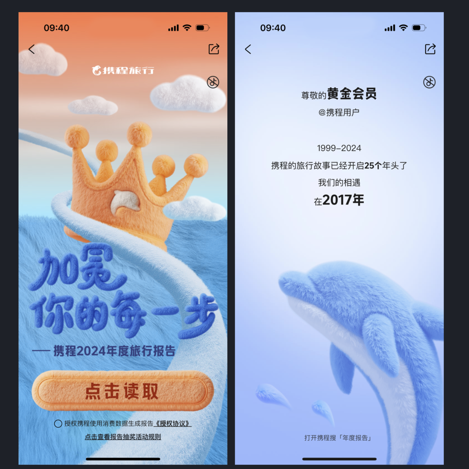 年度報(bào)告已成產(chǎn)品標(biāo)配,但想要讓人印象深刻,風(fēng)格化表達(dá)是關(guān)鍵。攜程旅行 2024 年度旅行報(bào)告以毛茸茸的設(shè)計(jì)語(yǔ)言,讓圖標(biāo)、字體、按鈕都透著柔軟質(zhì)感,在寒冬中給用戶帶來(lái)溫暖體驗(yàn)。報(bào)告不僅呈現(xiàn)出行數(shù)據(jù),更通過(guò) "加冕你的每一步" 的情感化文案,讓用戶在回顧旅程時(shí)收獲成就感,這種情感與風(fēng)格的雙重共鳴,讓分享欲自然提升。