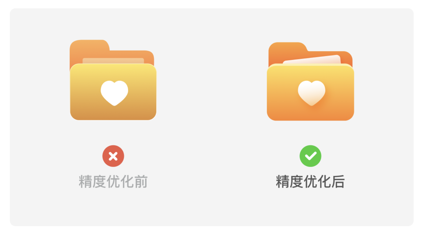 很多設(shè)計師認(rèn)為圖標(biāo)只要造型準(zhǔn)確就夠了,但恰恰是這些 “不起眼” 的小元素,最能暴露設(shè)計功底。以常見的文件夾圖標(biāo)為例,從 “能用” 到 “精致”,只需要 4 個關(guān)鍵調(diào)整:
