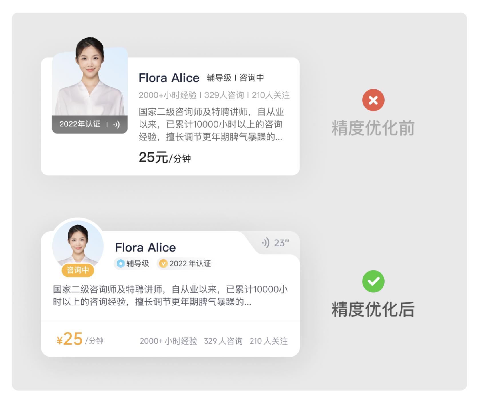 卡片中的關(guān)鍵數(shù)據(jù)(如咨詢費用、經(jīng)驗時長、咨詢?nèi)藬?shù))需要重點突出,但要避免多個視覺焦點沖突。可將費用 “25 元 / 分鐘” 改為 “¥25 / 分鐘”,放大字號并加粗;其他數(shù)據(jù)保持統(tǒng)一字號,用間距區(qū)分,讓用戶一眼就能捕捉到核心信息,提升決策效率。
