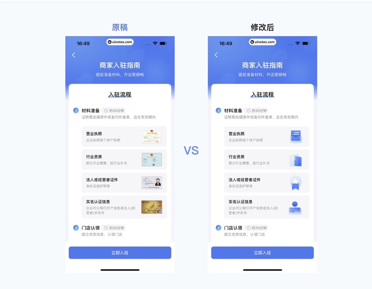 “設(shè)計(jì)稿我已經(jīng)交了,落地不好是開發(fā)的問題”,這種想法是設(shè)計(jì)師成長(zhǎng)的最大阻礙。設(shè)計(jì)不是孤立的環(huán)節(jié),而是商業(yè)流程中的重要一環(huán),從需求對(duì)接、方案設(shè)計(jì)到落地還原,每個(gè)環(huán)節(jié)都需要設(shè)計(jì)師主動(dòng)介入。曾有團(tuán)隊(duì)做一款商家入駐 APP,設(shè)計(jì)師提交的方案視覺效果極佳,但多個(gè)特效超出技術(shù)實(shí)現(xiàn)范圍,反復(fù)修改后不僅延誤上線,還讓設(shè)計(jì)效果大打折扣。