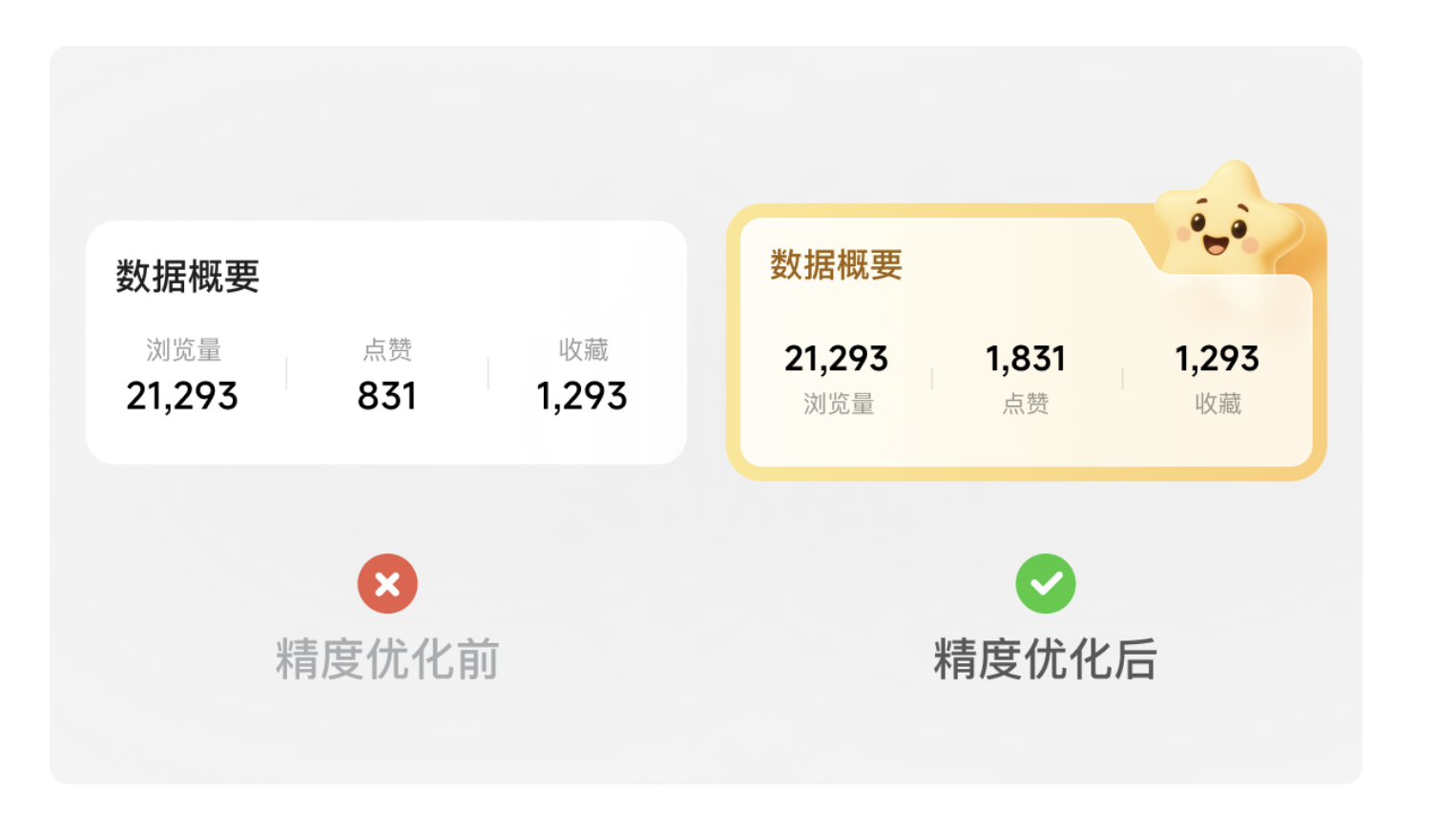 - 調整信息排版邏輯:將數據作為視覺核心,文字說明置于數字下方,符合用戶 “先看結果再看說明” 的閱讀習慣,比如 “瀏覽量” 文字放在 “21,293” 下方,讓數據一目了然。
