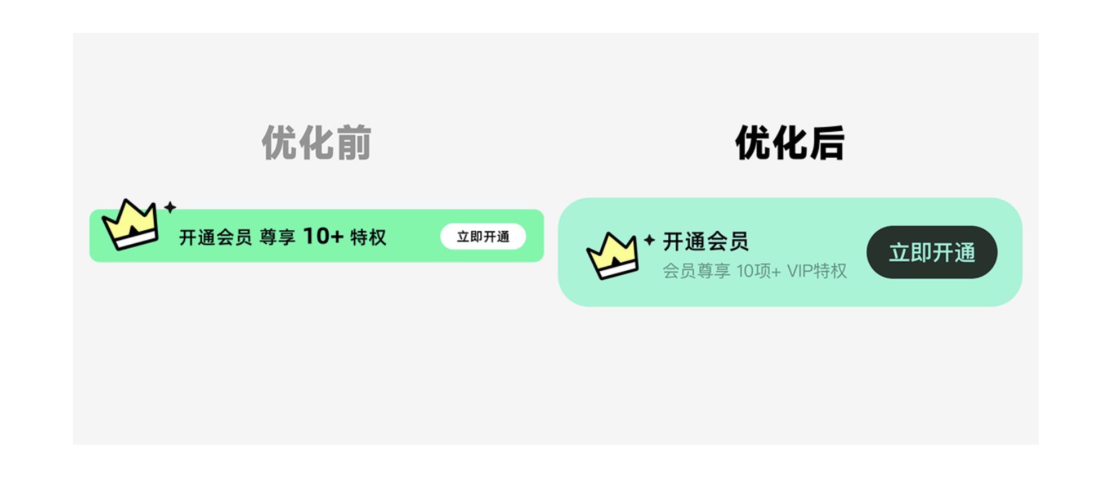 想要提升點擊轉化,需主動增加視覺層級:首先拆分文案,標題放大加粗,次要信息(如 “10 項 + VIP 特權”)縮小弱化,形成清晰的信息主次;其次優化按鈕設計,選用高對比度顏色(如黑色背景搭配白色文字),調整按鈕尺寸,讓按鈕更突出;最后添加細節裝飾,比如給卡片增加半圓切割背景、輕微投影,增強空間感,讓入口設計更有記憶點。