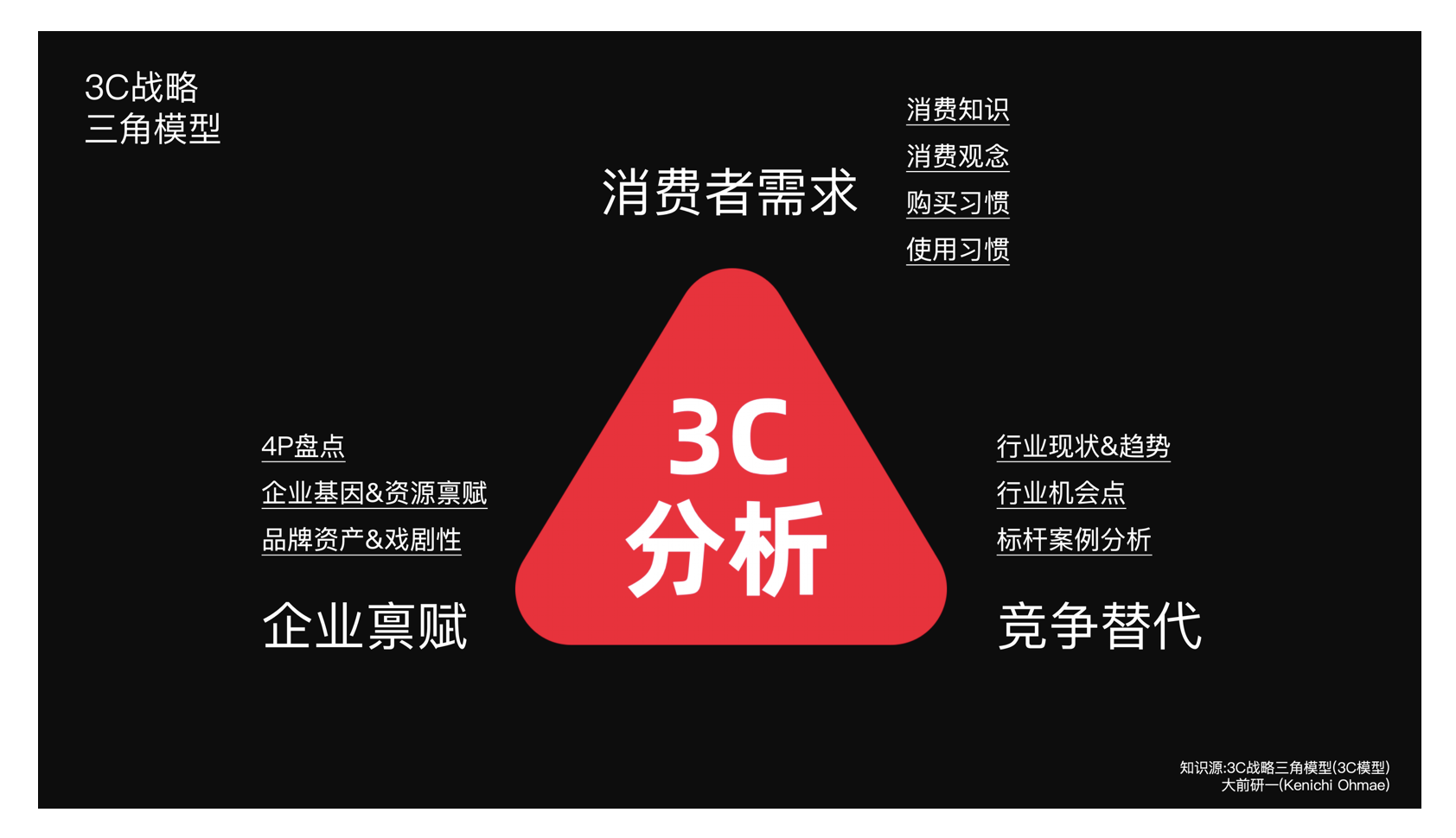 品牌打造的第一步,絕非盲目投入,而是基于充分調(diào)研的戰(zhàn)略決策。知魚品牌始終遵循 “決策 = 思維模型 × 信息量” 的核心原則,運用大前研一的 3C 戰(zhàn)略模型,從行業(yè)、用戶、企業(yè)三個維度全面拆解,尋找最優(yōu)解。