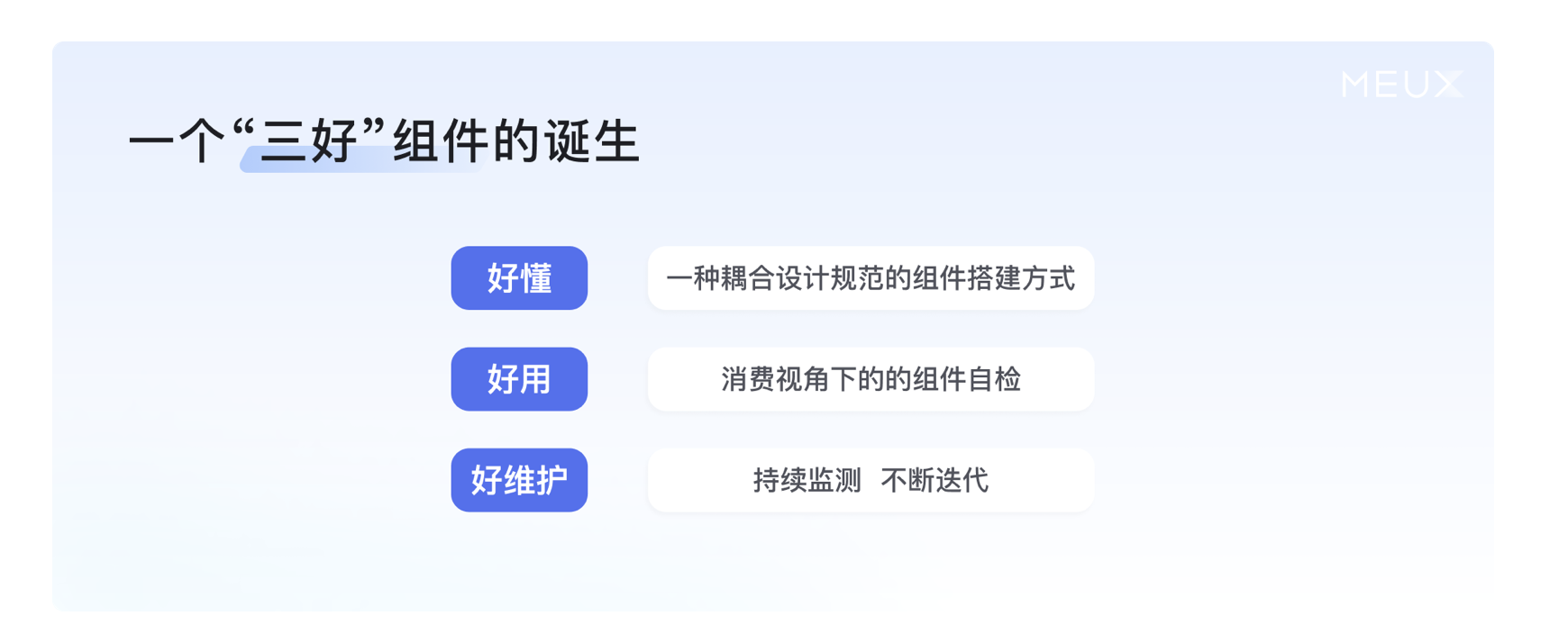 這 "三好" 標準構成了組件庫建設的核心綱領,指引著從搭建到維護的全流程實踐。