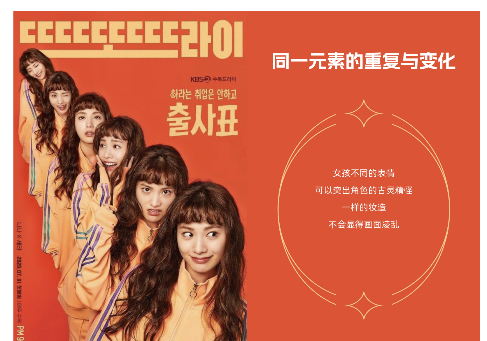 變化是為了讓重復(fù)更具活力,而非打破整體的統(tǒng)一性。在設(shè)計(jì)中,變化的維度應(yīng)控制在有限范圍內(nèi),如顏色、大小、細(xì)節(jié)形態(tài)等,避免因變化過多導(dǎo)致畫面混亂。女孩表情重復(fù)的設(shè)計(jì)中,妝造、構(gòu)圖保持統(tǒng)一,僅表情發(fā)生變化,既保證了畫面的整體性,又通過變化傳遞豐富信息;健身主題設(shè)計(jì)中,“FAT” 到 “FIT” 的轉(zhuǎn)變僅替換核心元素,版式與色彩保持一致,讓創(chuàng)意表達(dá)既清晰又不破壞重復(fù)的秩序感。