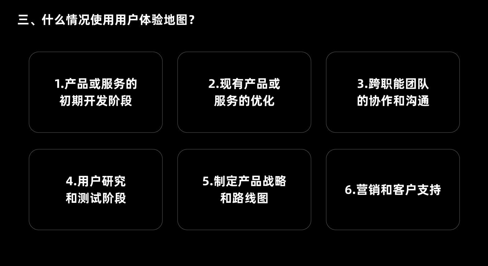 用戶體驗地圖并非產品設計的 “萬能公式”,但在產品全生命周期的多個關鍵階段,能發揮顯著作用,核心適用場景主要有六大類: